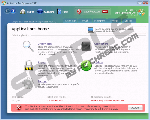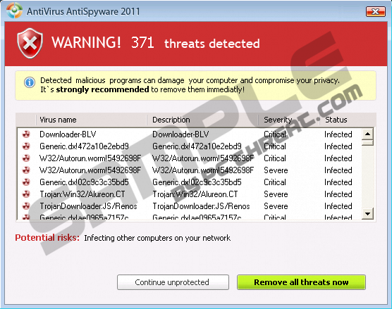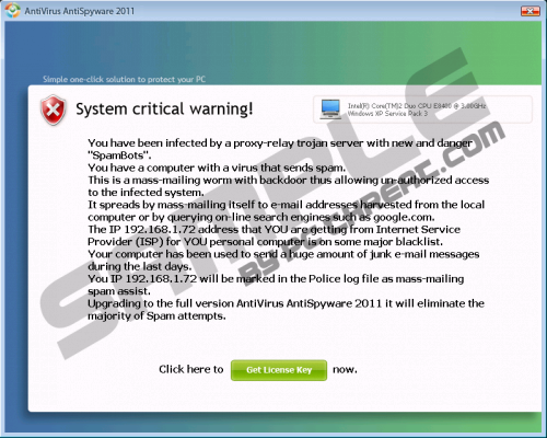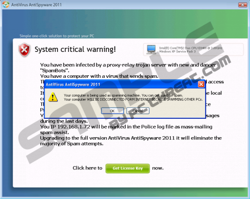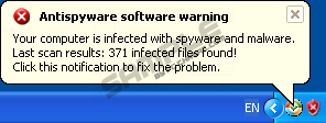 Antispyware software warning Your computer is infected with spyware and malware. Last scan results: 371 infected files found! Click this notification to fix the problem. AntiVirus AntiSpyware 2011 Click here to Get License Key now.