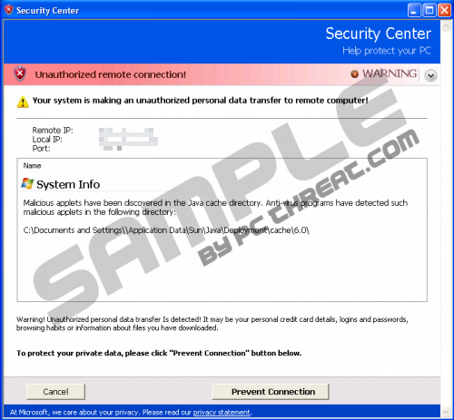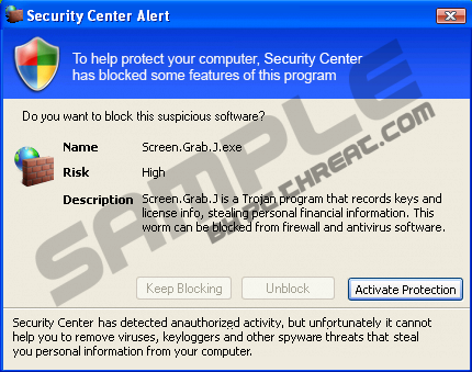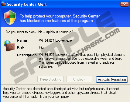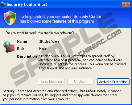 Security Center Alert To help protect your computer, Security Center has blocked some features of this program Do you want to block this suspicious software? Name: Sft.dez.Wien Risk: High Description: Sft.dez.Wien is a virus attempts to spread itself by attaching to a host program, and can damage hardware, software or data in the process. This worm can be blocked from firewall and antivirus software. Activate Protection Security Center has detected anauthorized activity, but unfortunately it cannot help you to remove viruses, keyloggers and other spyware threats that steal you personal information from your computer. AntiVirus AntiSpyware 2011 BUY NOW!