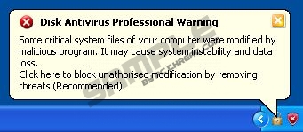 Disk Antivirus ProfessionalDisk Antivirus Professional is a bogus security program which has been created to rip you off. The rogue application is a clone of the infamous Live Security Platinum and System Progressive Protection. If you have this so-called malware removal program on your PC, you should act immediately to remove it from the system. It has to be done immediately in order to prevent you from further malware attacks and enable the system run properly. If you do not remove Disk Antivirus Professional Virus, you will be constantly bombarded with fake security notifications aimed at convincing you to activate the program. The activation is said to be necessary in order to remove various threats which are supposedly detected by the program. The infections which are listed in the fake scanner are provided to make you purchase the license for Disk Antivirus and here you will find some example how the rogue software attempts to deceive you: Warning! Disk Antivirus Professional Warning Disk Antivirus Warning Additionally, Disk Antivirus Professional Virus can disable some executable files so that you cannot launch your anti-virus program and remove the infection. Note that you may also be warned that the website you want to visit is insecure: Warning! The site you are trying visit may harm your computer! Various alerts and notifications are expected to make you think that you have no choice but activate Disk Antivirus Professional. The truth is that the only way to protect your computer is remove Disk Antivirus Professional, which you should do using SpyHunter, which can easily remove fake AVs, ransomware infections, and other dangerous threat. To easy up the removal of Disk Antivirus Professional Virus, apply the code given below. It will disable fake pop-up messages and the scanner so that you can access the Internet without any problems and download the spyware removal tool: AA39754E-715219CE Do not waste your money on fake tools but invest in a legitimate and powerful program which will protect you against future infections. Removal Video: | ||||||||||