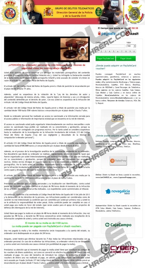 Grupo de Delitos Telemáticos virusGrupo de Delitos Telemáticos virus is a computer infection that you will definitely notice at once. This ransomware application blocks desktop access and demands ransom fee, if you want to unlock your computer. It also says that all of your data will be formatted if you trying unlocking your PC on your own. However, just like most of the malware promises, this is not valid as well. You need to remove Grupo de Delitos Telemáticos virus from your system right now and then safeguard your computer against other possible infections, because malware is always there, ready to exploit system vulnerabilities. This infection comes from Ukash Virus group and it borrows its name from the Ukash payment system. Grupo de Delitos Telemáticos virus makes use of Ukash and PaySafeCard alternative payment methods to collect the ransom fees, but do not be deceived – these payment systems are absolutely legal and malicious ransomware infections are using them, because the transfer method is really easy and they do not require bank account or a credit card number. This way Grupo de Delitos Telemáticos virus manages to affect a lot more people, but those users who have already been acquainted with Dirección General de la Policía Virus or Cuerpo National de Policía virus will definitely know that the notification on your screens is not real.