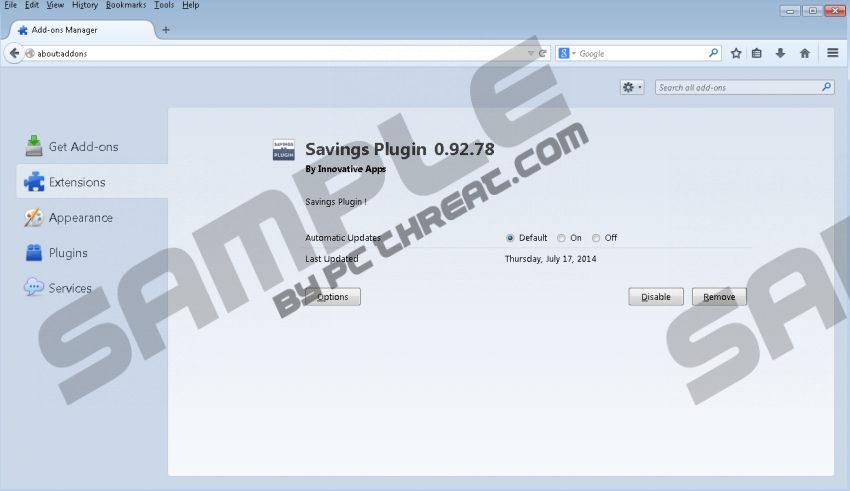 Savings PluginSavings Plugin is a free browser add-on which is supposed to help you save money when shopping on the Internet. The program is compatible with Internet Explorer, Mozilla Firefox, and Google Chrome. In the case of the latter, you have to activate the browser add-on to get it to work. Savings Plugin is promoted on savings-plugin.com and is also bundled with other free programs. The browser add-on was built using the Crossrider engine, which is widely used by soft creators. Savings Plugin is published by Innovative Apps, also known as Engaging Apps and 215 Apps. This software publisher is notorious for many identical browser add-ons, including Savings Hunter, SlamDunk Savings, and many other browser add-ons. Savings Plugin is an ad-supported program, and it displays third-party advertisements, including coupons, web banners, pop-up advertisements, pop-under advertisements, and in-line ads, which pop up on commercial and non-commercial websites, including eBau, Amazon, Walmart, Target, Best Buy, YouTube, and other websites. According to the official website, this adware program can save you hundreds of dollars, but you should keep in mind that this program may also cause some damage. The program itself is not harmful but the pop-ups displayed by this program may redirect you to some malicious websites. It is so because Savings Plugin is not liable for the content displayed on your screen and the privacy policies of third parties. You interact with Savings Plugin at your own risk, which is why we strongly recommend that you remove Savings Plugin from the computer as soon as you can. Even though some of the advertisements provided to you by Savings Plugin have nothing to do with your interests, the adware program is recording your online actions. In order for the developers of the adware program to determine your browsing patterns, Savings Plugin records your clicks, impressions, search terms, browsing history, time spent on the website you browse, browser settings, and other non-personally identifiable information. The information collected may be used for various purposes, including advertising and marketing, and, if you want to prevent targeted advertisements, you should remove Savings Plugin from the computer as soon as you can. Our below given instructions should help you uninstall Savings Plugin from the computer but you should also shield the computer from various threats. Our team recommends using SpyHunter because this real-time security tool can easily remove Savings Plugin from the computer and fight off many other malware programs, including Trojan horses, browser hijackers, ransomware infections, worms, etc. If you want to be secure on the Internet, take action right now to remove Savings Plugin for good. How to remove Savings PluginWindows Vista and Windows 7