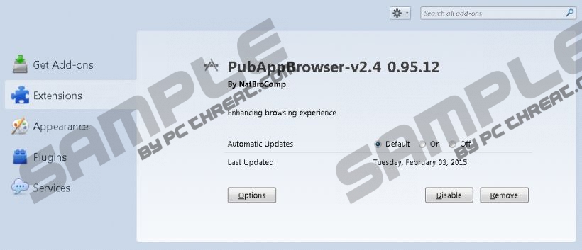 PubAppBrowserPubAppBrowser is a browser extension created by NatBroComp. The company has employed the infamous Crossrider engine to build this suspicious application, which is why it is not surprising that it works very similar to SuperPlusRadio, BingTracker, Hdview, and other Crossrider advertisement-supported programs. Should you delete these programs from your operating system? Our malware researchers believe that you should, and this report will help you remove PubAppBrowser. How did you install PubAppBrowser on your operating system? Most users download the program with a bunch of other programs. PubAppBrowser is attached to software bundles, because regular computer users would never learn about it in any other way. Needless to say, malware could be installed via bundles, and this is why our virtual security experts do not recommend trusting this method of software distribution. If PubAppBrowser has been installed with other programs, it is a good idea to inspect them to learn if you do not need to remove malware from your operating system. Even though adware, or advertisement-supported software, is rarely considered to be malicious, there is no doubt that PubAppBrowser is an unreliable program. First of all, computer users cannot know how it works, considering that there is no official information regarding it. Second, the application can connect to unreliable adware servers to display highly suspicious, often misleading ads. Third, PubAppBrowser can install tracking cookies to spy on you. You need to delete these cookies to stop them from collecting information about you, your browsing activity, and your preferences. Some computer users decide to delete PubAppBrowser manually. If this is your preference, you have to follow the guide below and uninstall PubAppBrowser-v2.4 (the number of the version might be different). After this, you need to inspect your PC to discover other threats that might require removal. Then you need to delete these threats. In addition, you need to remove malicious files and registry entries. On top of that, you need to protect your operating system so that PubAppBrowser and similar threats could not slither in again. Are you still interested in manual removal? We can offer you a better alternative to the manual removal of PubAppBrowser. We offer an automatic malware detection and removal tool that you can use to automatically delete PubAppBrowser and other computer infections. Click the download button and install the program, and soon enough your operating system will be cleared from malware. Need advice regarding the removal? Use the comment box below. PubAppBrowser RemovalRemove from Windows XP: