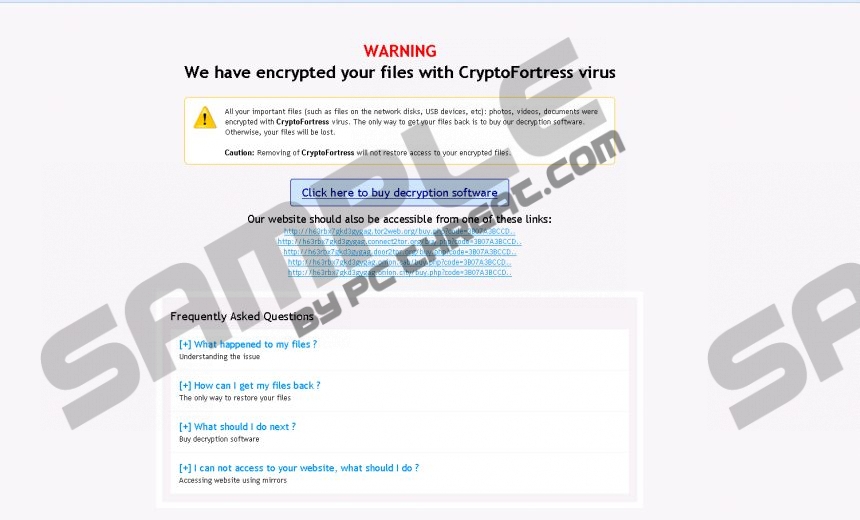 CryptoFortress RansomwareCryptoFortress Ransomware is an annoying infection that has been created to bully unsuspecting computer users into spending their money for nothing. You need to delete CryptoFortress Ransomware from your computer, and it shouldn’t involve spending a lot of money on unreliable decryption keys. You need to understand that paying the ransom fee is out of question as you should not help cyber criminals to get rich. The best way to protect your computer from the likes of CryptoFortress Ransomware is acquiring a legitimate computer security application that would run regular system scans, providing real-time assistance. According to our research, CryptoFortress Ransomware encrypts almost the same files as TorrentLocker ransomware application. This shows that both infections are related, and it also suggests that the program we’re dealing with here comes from a long list of malicious computer infections. It is an extremely annoying computer security threat because, apart from encrypting most of your files, CryptoFortress Ransomware also denies access to your web browser, and each time you try to access the Internet, it displays the following message: