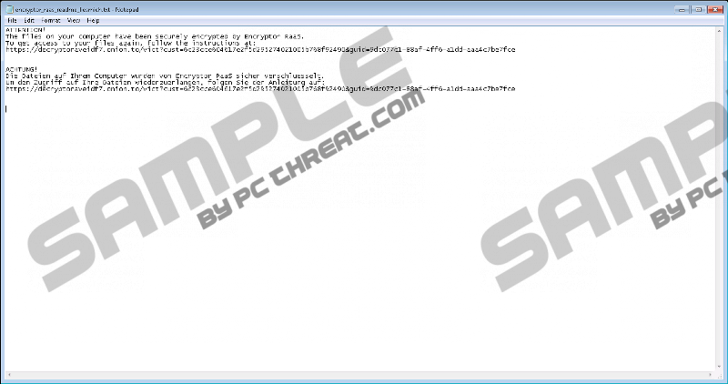RaaS RansomwareOne of the main reasons computer security experts say that you should always keep your files backed up on a cloud drive (or another storage system) is the likes of RaaS Ransomware. Lately, we have been experiencing an onslaught of the so-called crypto ransomware infections. These programs encrypt user’s files and ask for a ransom fee to be transferred as soon as possible. Unfortunately, the chances are that the encrypted files cannot be restored because money is the only thing on the criminals’ minds. However, you can still protect your computer from the likes of RaaS Ransomware by acquiring a reliable antimalware application. Not to mention that there might be some leftover files on your PC you have to delete. The reason we are talking about leftover files here is that upon the encryption RaaS Ransomware deletes its main files from your computer. So technically, there is nothing left to remove once you get down to this infection. You are left with just a bunch of your files that have been encrypted, and you can no longer access them. RaaS Ransomware only displays a text message on your screen with a link you have to click in order to decrypt the affected files: