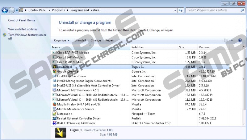 DownQuickDownQuick should act as a program that allows you to download your favorite files from the Web. It says that you will be able to manage your downloads, choose their orders, and stop and resume them whenever you want. However, this program is also involved in shady activities. It tries to bring additional applications to your system; it may try to replace your default search engine and homepage, and it can make your PC run more slowly because of the ads Down Quick displays. We strongly believe that you should not tolerate this potentially unwanted application any longer, so consider its removal as a priority task. The program makes no secret that its official installer will offer you additional software such as various types of apps and toolbars. According to DownQuick, it is up to you whether to install those programs or not. However, to avoid additional programs, you need to be very attentive and carefully examine each section of the DownQuick’s installation wizard. One single mistake and your computer may be flooded with many suspicious applications. It will be hard to detect all of them, and you will surely need a trustworthy anti-spyware scanner for this. DownQuick will not only try to add some other applications on your system. It may be involved in even more unreliable activities. For example, this program may change your browser’s initial settings. You may not even notice the changes until you find yourself redirected to suspicious pages after searching for something on the Web. That is because DownQuick may have already changed your default search engine. You can be transferred to unknown websites for one more reason. The download manager may display you commercial offers that contain redirect links to third party websites. “WE ARE NOT RESPONSIBLE FOR THE TERMS AND CONDITIONS OF ANYTHIRD-PARTY OR PARTNER WEBSITE OR OFFERS REGARDLESS OF WHETHER THE OFFER IS HOSTED BY US.” This quote from DownQuick’s Terms and Conditions should be enough to prevent you from clicking on any of the ads this program displays. You will face all the consequences yourself if any third-party website you are transferred on is filled with offensive or malevolent content. We had a reason to name DownQuick as a potentially unwanted application. During their research, our online security specialists have found that this program is usually distributed in bundles with free software. The common way how unaware users receive unwanted programs is when they frequently visit p2p, Torrent, or similar websites. Those users usually get enticed by an offer to download updates to their video or media players. However, they receive a bunch of additional programs, and some of them can be of a harmful nature. So, if you do not remember installing DownQuick purposely, then scan your system ASAP to be sure that no intruders managed to hide somewhere on it. The file downloader will not bring any significant benefits to you. It can only cause you trouble and explore your system’s vulnerabilities. Therefore, do not waste any more time before removing DownQuick for good. We have prepared a short guide that should assist you in the elimination process. Feel free to post your question in the comment box below or to address us via our Google+, Facebook, or Twitter pages. How to eliminate the unwanted applicationWindows 7 and Windows Vista