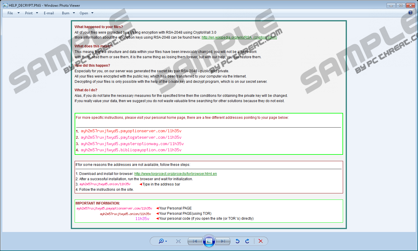 HELP_DECRYPTHELP_DECRYPT is a set of files that are left behind after your computer is infected by the Cryptowall 3.0 ransomware. Needless to say, you ought to remove this ransomware along with the HELP_DECRYPT files, because this infection will wreak havoc on your computer. This ransomware was developed with the intention of infecting as many computers as possible and encrypt certain file formats that are most commonly used to store personal information. After encrypting these kinds of files, Cryptowall 3.0 generates three HELP_DECRYPT files that contain instructions on how to pay the ransom, and therefore get the promised decryption key. However, from the very outset we must warn you that you may never receive the decryption tool. We recommend that you remove this infection using an anti-malware program and try getting a third-party decryption tool to try and restore your files. Please read this more detailed description below for more information. It is very difficult to pin point the exact sources where ransomware comes from. Cryptowall 3.0 is no exception in this case. We have received unverified information that this infection may be distributed with the help of phishing emails. These kinds of emails are made to appear as if they come from legitimate legal entities or an actual person. Phishing emails try to trick you into clicking a link inside the email that will redirect you to a fraudulent website that may contain Cryptowall 3.0. Alternatively, an email may contain infected attachments, such as a Word document with enabled macros or a plain ZIP archive file. Of course, its developers may employ different techniques as well. However, this scenario is the most likely one, since most ransomware is distributed in this manner. Cryptowall 3.0 is similar to the 2.0 version as the dropper file is encrypted with a custom algorithm three times. But that is as far as their similarities go. Furthermore, this newer 3.0 version does not have three functions that were present in the previous version, namely Switching between 32 and 64 bit operation, employing multiple exploits in the dropper, Anti-Vm check to prevent running in virtual environment. But these are minor changes nonetheless. Once your computer becomes infected with Cryptowall 3.0, it will scan it for personal files, such as .doc, .docx, .pdf, .jpg, and so on. This ransomware encrypts all such files using the RSA encryption algorithm. After the files have been encrypted the infection will leave the aforementioned three files called HELP_DECRYPT. However, the file formats differ. One file is in the .txt format, the second one is in .png, and the last one is .html. All of the HELP_DECRYPT files contain the same information and instructions on how to purchase the decryption key that costs a whopping $500 USD worth of Bitcoins. The instructions are based on the IP addresses location and the language is selected accordingly. As previously sated, you should not pay the ransom, because there are no guaranties that you will receive the decryption tool. The main visual difference between Cryptowall 3.0 and 2.0 is that the latest version features the HELP_DECRYPT files that contain instructions on how to play the ransom. These files are a clear indication that your files were infected and your computer will be littered with them as each folder containing an encrypted file will feature HELP_DECRYPT files. We highly recommend that you first remove this infection using a antimalware tool, such as SpyHunter, and then try obtaining a third-party decryption tool. However, there are no guaranties that your files will be recovered. Remove the ransomware