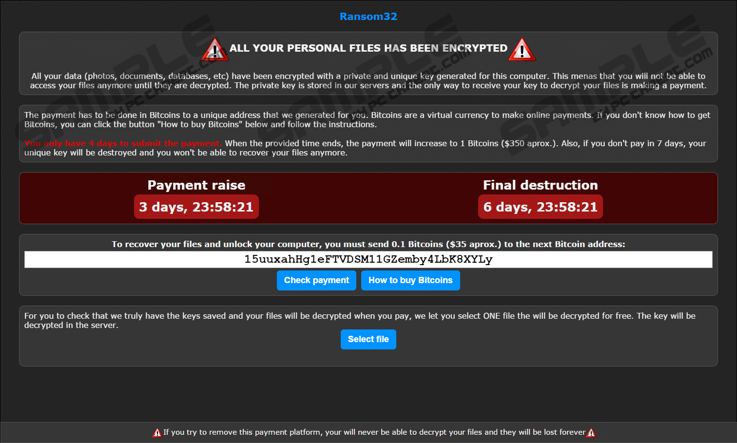 JS.Crypto RansomwareJS.Crypto Ransomware is a very harmful infection that targets computers with the Windows OS. As the threat itself is created using NW.js, which is known to be a framework for the development of new applications, it means that JS.Crypto Ransomware itself is based on the JavaScript. Specialists working at pcthreat.com say that there is a small possibility to affect Linux and MaxOS X using the JavaScript too, which means that JS.Crypto Ransomware might start spreading among the users of these operating systems as well. In our opinion, all the users have to be very cautious no matter which OS they use. It is because recent research has shown that it is possible to become an affiliate of JS.Crypto Ransomware, i.e. to distribute it by selecting specific options, e.g. whether or not to fully lock the computer, show Lockscreen, and even the amount of Bitcoins to demand. The original owners of JS.Crypto Ransomware probably get some money for that. We are sure that you will recognize if JS.Crypto Ransomware manages to enter the system because you will see that you cannot access your major files. Unfortunately, JS.Crypto Ransomware might encrypt your new files once again too, so make sure that you remove this infection from your PC before you store new files on your computer. It has been noticed that JS.Crypto Ransomware itself encrypts hundreds of different files. These files are documents, pictures, music, and videos mainly, so they usually have the following extensions: .jpg, .jpeg, .pmd, .ppsx, .mp3, .mp4, .mpeg, .wmv, .sdf, .mpa, .dot, .docx, .aet, .ppj, .indl, .3gp, and others. Their appearance will probably not change, but you will simply not be able to access any of them. The inability to access the majority of files is not the only symptom which shows that a ransomware infection has slithered onto your computer. Specialists working at pcthreat.com say that you will definitely notice a warning message on your screen too. If you see it (the text of the message is provided below), there is no doubt that JS.Crypto Ransomware has managed to enter your system.
