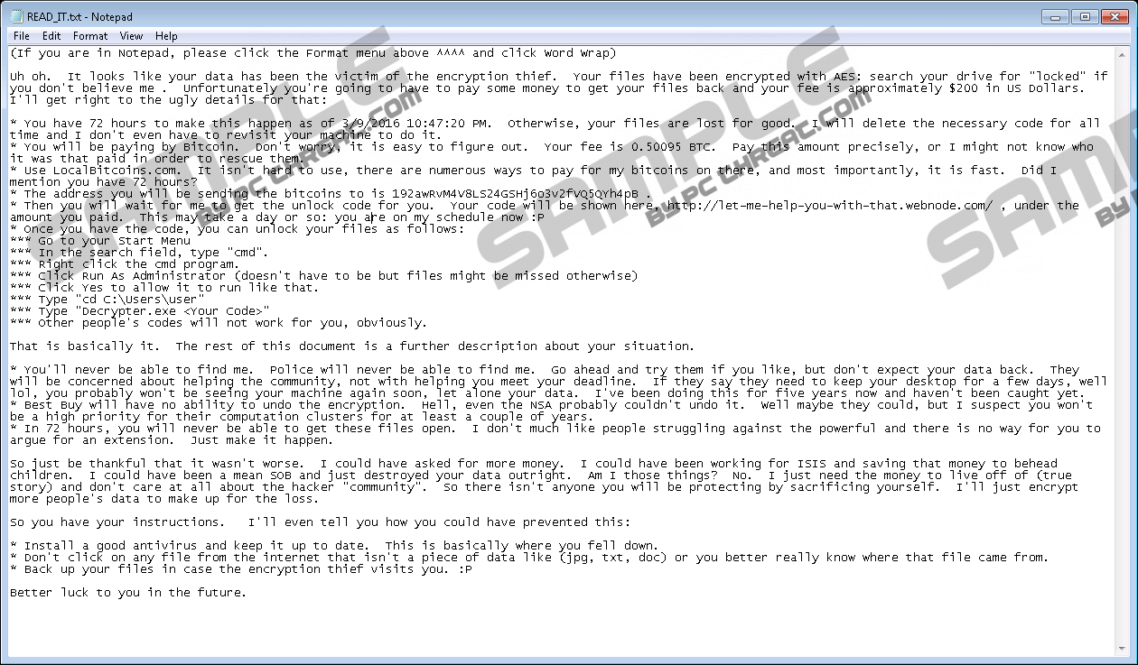 Of course, users open the file and notice that they need to pay a ransom of approximately $200 in Bitcoins within 72 hours in order to decrypt their files. The information provided in READ_IT.txt says that users need to send the EXACT amount of Bitcoins because the decryption key will be put on the let-me-help-you-with-that.webnode.com website under the amount of Bitcoins that has been paid. Once the key is obtained, users should go to %USERPROFILE% and find Decrypter.exe. This is a tool that will decrypt files for you, so double-click on it. You can be sure that the decryption process has been successful, if you see a wallpaper with these words: “Thank You (BTW, this is just a wallpaper).” Remember, you cannot remove the ransomware infection if you are ready to pay a ransom because it will be impossible to do that after the deletion. There is a solution for those users who do not want to make a payment too. In order to gain access to .php, .log, .myo, .qif, .psd, .aspx, .html, .xml, .txt, .doc, .xls, .pdf, .ppt, odt, .gif, .jpg, .db, .csv, and a bunch of other files, you need to delete Locked Ransomware and restore those files from a backup. In other words, you have to remove the ransomware infection (to prevent it from encrypting files once again) and then transfer all files from the backup to the computer. Unfortunately, there is no other way to decrypt files without paying money at the time of writing. As there are so many ransomware infections, you should know how they are distributed mainly in order to be able to protect your system from them. According to our specialists, ransomware infections are mainly spread as spam email attachments. If users download such a malicious attachment, Locked Ransomware starts doing its activities immediately. Of course, this is not the only way such threats travel. It has been found that they might attach to other programs too and sneak onto computers together with them. Last but not least, other infections existing on the system can download ransomware, which shows why it is so important to keep the system clean. It is a difficult job to protect the system from harm, so less experienced users might not be able to do that. If you are among them, install a security tool on your computer and always keep it there. If you are not going to pay money for cyber criminals and simply want to erase this ransomware infection, you can easily download the antimalware scanner from our website (click on the Download button), upgrade the tool, and scan your system. Another way to erase this threat is to remove the malicious file which you have downloaded on your system, file with the random letters from %APPDATA%, Decrypter.exe and ransom.jpg from %USERPROFILE%, and READ_IT.txt from the Desktop. You will also need to take care of other untrustworthy programs that might have been installed on your computer as well. Delete Locked Ransomware