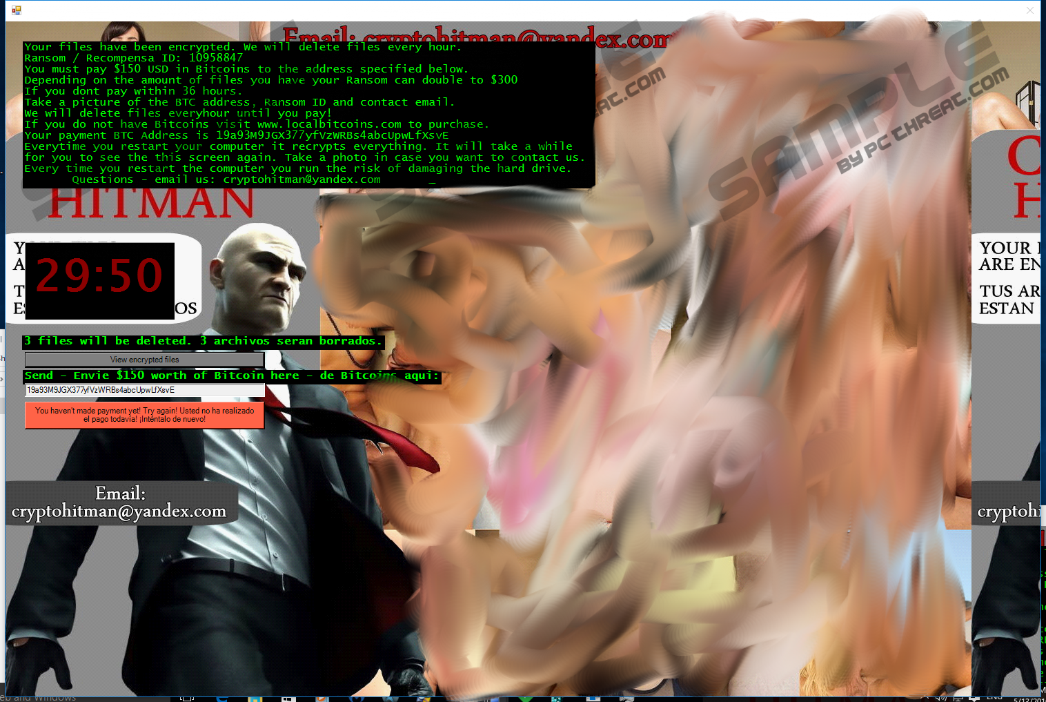 Every single file infected with this ransomware is given the “.porno” extension, and there is no real reason for that. The ransomware does not decrypt files by their extensions, and you can remove them without any problems. According to our researchers, the only reason behind this extension is to get your attention and, possibly, make it easier for you to see which files are encrypted. If you look at this, it is not surprising that more users recognize this infection as .porn virus rather than CryptoHitman Ransomware, despite the fact that “virus” is not even the right term. ImportantDocument.doc.porn is an example of a file encrypted by this malicious infection, and you will probably ask yourself what this extension has to do with pornographic content. As you might have noticed already, this kind of content is shown on the notification that represents the demands of cyber criminals. This also suggests that maybe this infection is spread via websites associated with pornographic content. The main goal for the malicious .porn virus is to force you into paying a ransom of $150. Users are threatened that this ransom will go up to $300 if the initial sum is not paid within 36 hours. The pressure to pay the ransom is extremely high, and cyber criminals have employed a very aggressive tool to accelerate action from you. They delete several files every hour that goes by, and this is what is most likely to push users into purchasing bitcoins and making the payment via the given BTC address. Based on the fact that some of the information within the notification is presented in Spanish (mostly in English), it is likely that it is targeted at users living in Spain or South America. Wherever you live, if this infection attacks your PC, encrypts your files, and introduces you to a scary message urging to pay a huge ransom, you are in big trouble. The good news is that a decryption tool has been rumored to exist. If you have time – before your files get deleted – look into authentic decryption tools. Maybe you do not need to pay the ransom! Whatever happens to your files, you MUST delete .porn virus from your operating system. If you end up sacrificing your files (which might be worth it, if your personal files are backed up safely), remove the malicious ransomware and erase all files with the “.porn” extension. We believe it is best to use anti-malware software, especially if you think about further Windows protection and if other threats run along with the ransomware. If this is not an option for you, follow the guide below. .porn Virus RemovalN.B. If you erase the malicious ransomware, it will seize deleting your personal files every hour.