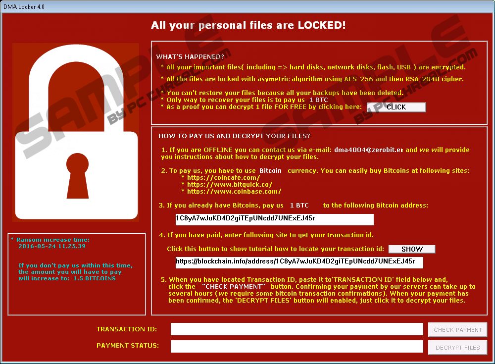 DMA Locker RansomwareThere is a reason computer security experts are really eager to convey how important it is avoid opening email messages from unknown senders. DMA Locker Ransomware is a malicious computer infection that makes use of spam email to reach target computers. It goes without saying that getting infected with ransomware is extremely annoying and frustrating. In this article, we will tell you how this infection works, and we will also give you instructions on the DMA Locker Ransomware removal. You have to do everything you can to get rid of this infection because the longer it remains in your system; the more it will terrorize you. We believe that ransomware applications are adept at forcing users into giving away their money because the criminals behind these acts have a lot of practice. As we can see from the program’s interface, it is already a fourth version of the same application: DMA Locker 4.0. So we can easily assume that the people who create such applications definitely know what they are doing. For example, if we take a closer look at the notification, we would see that it does a good job at catching your attention just by being red. Then, DMA Locker Ransomware also says that all your personal files are locked, and you must now pay a particular amount of bitcoins to retrieve your data. Here is an extract from the notification: