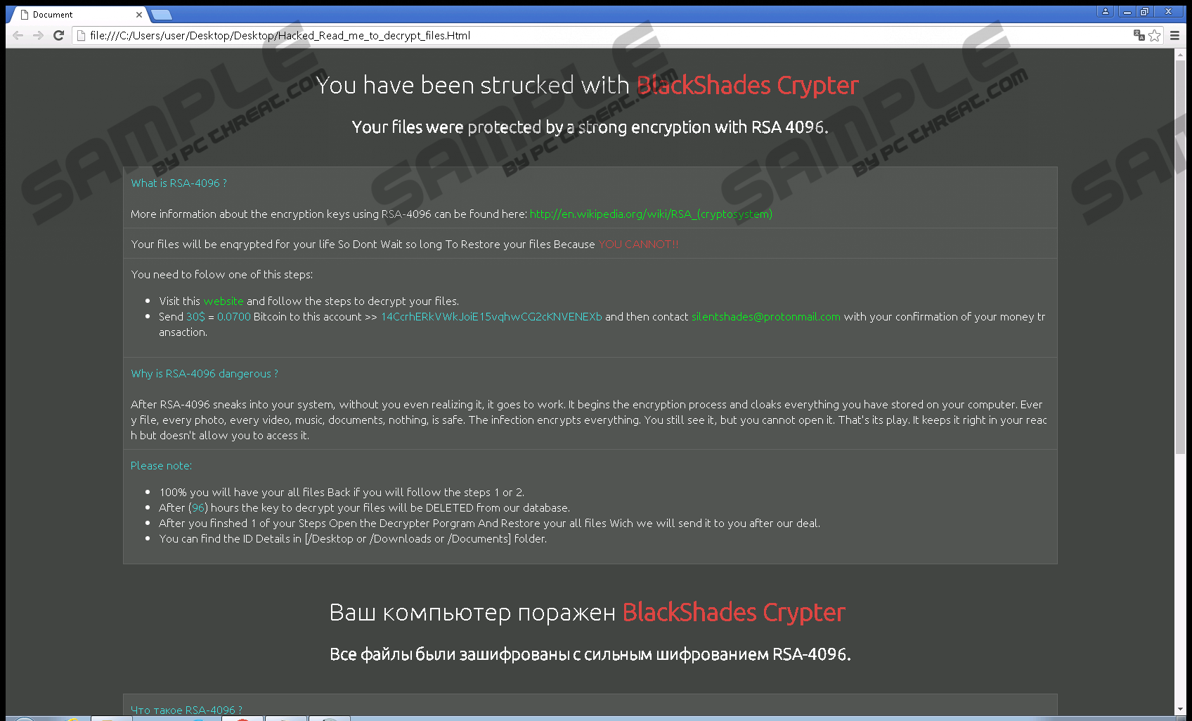 BlackShades Crypter RansomwareBlackShades Crypter Ransomware is one sneaky infection that slithers in and performs malicious actions without alerting the user. After it is done with its main task – which is encrypting personal files – it does not show a pop-up notification or replace your Desktop wallpaper with the message. Instead, it creates files containing some information, and it is up to the user to find them and figure out what is going on. In fact, according to our research team, there are only two ways that users can detect this threat. They either detect the files and folders created by this infection, or they discover the encrypted files with the ".silent" extension (e.g., example.jpg.silent). If executed successfully, it encrypts documents, media files, and other personal files that are impossible to replace, unless you have backups. Needless to say, removing BlackShades Crypter Ransomware is crucial, but there are a few other things you need to figure out before that. Do you know how BlackShades Crypter Ransomware is distributed? Do you understand why it is important to know this? The distribution of this threat reveals the vulnerability within your operating system, and you need to fix it to ensure that other dangerous threats cannot attack in the future. Based on our research, we believe that the main source of distribution is corrupted spam email attachments. Cyber criminals can use mass spam email attacks using the email addresses collected by unreliable programs (e.g., via fake surveys), or they can hijack personal email accounts to spread corrupted emails on a more personal level. In the case of BlackShades Crypter Ransomware, it is more likely that it will be spread to random addresses, and the corrupted file is likely to be camouflaged as invoice or a document file. Once opened, the ransomware is silently executed, and it proceeds to create files. The devious, clandestine BlackShades Crypter Ransomware copies itself into two different directories: %APPDATA%\Windows and %APPDATA%\Microsoft\Windows\Start Menu\Programs\Startup. In both of these directories, the malicious .exe files have the same name, which, in the long run, makes it easier to detect and delete them. According to our research, the file in the %APPDATA%\Windows directory also creates a point of execution (“Driver”) in HKCU\Software\Microsoft\Windows\CurrentVersion\Run that, of course, also must be removed. Additionally, the ransomware creates three different files: YourID.txt and Ваш идентификатор, both of which provide a unique user ID that is required for the requested payment, as well as Hacked_Read_me_to_decrypt_files.Html. This file represents the demands of the creators of the malicious ransomware. Here are a few excerpts: