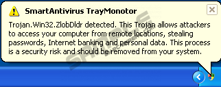 Trojan.win32.ZlobDldrTrojan.win32.ZlobDldr is regarded as an extremely dangerous Trojan horse Trojan Zlob, which is actually promoting Smart Antivirus 2009 rogue antispyware software. This Trojan is capable of causing damage to a user‘s computer system, and may even cause loss of data. The following error messages may appear on a user‘s PC, should their system be infected with the malware, will read as follows: “SmartAntivirus TrayMonotor Should a system be infected, the computer user will be able to find mwin32.exe or Trojan.win32.ZlobDldr in their processes list. Important to note: Trojan.win32.ZlobDldr can be extremely difficult to remove manually, as this particular Trojan is capable of updating and recreating itself by using security backdoors. It is recommended that once detected, the user should immediately remove Trojan.win32.ZlobDldr from the infected computer system. |