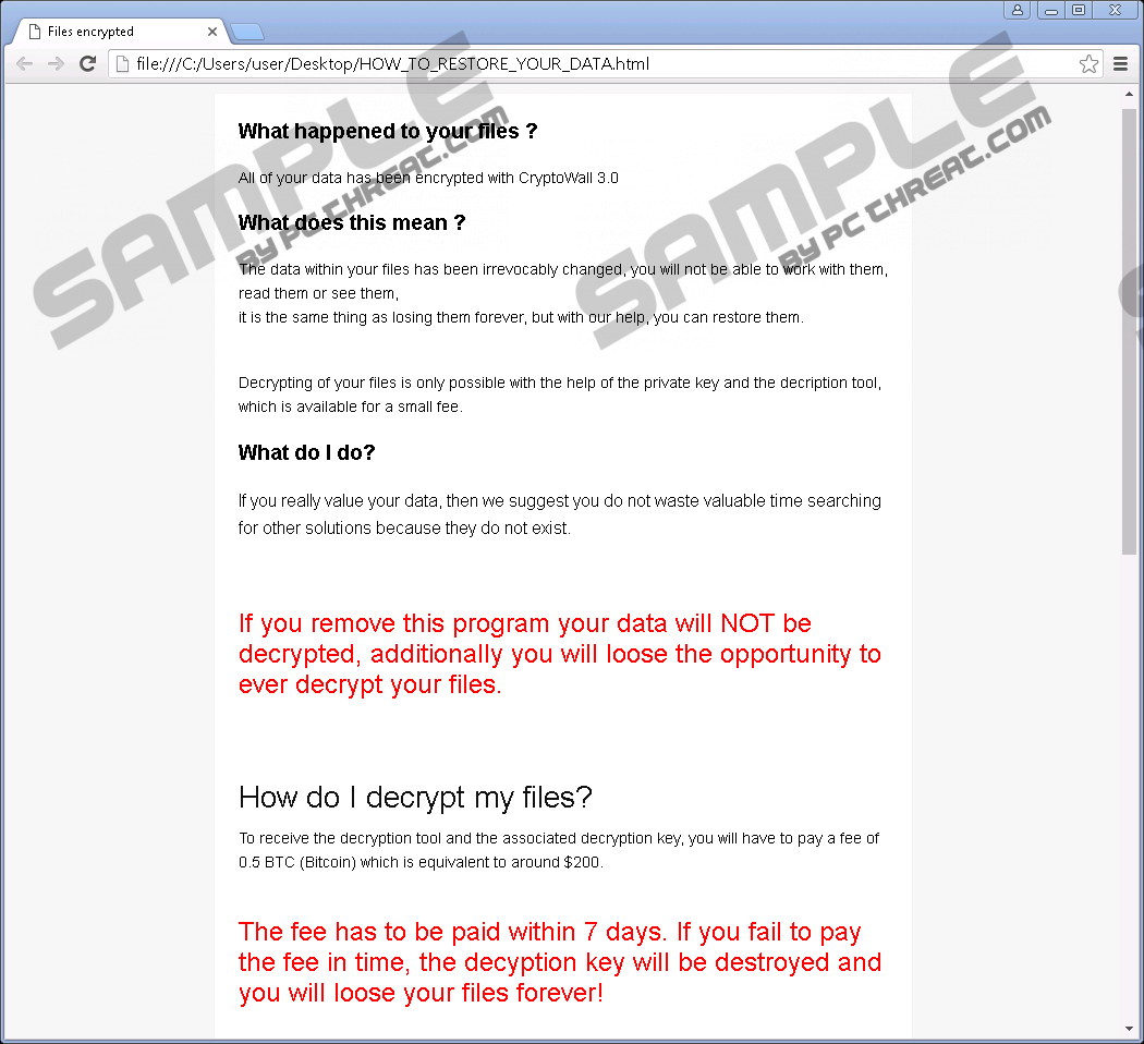 Protected RansomwareProtected Ransomware claims to be Cryptowall 3.0 on the ransom note that it leaves after it encrypts user data. Nonetheless, our researchers doubt it because this malware seems to be working in a different manner. It asks users to pay approximately 225 dollars in exchange for a decryption key. In addition, you have to transfer the money within seven days. If you do not intend to put up with these demands, you should delete the ransomware from your PC. Just scroll below the text and you will find the removal instructions that should help you with this task. However, if you are facing such threat for the first time, it would be a good idea to read a full article. This way you might learn how to defend your system from such malware henceforth. The malware is called Protected Ransomware because it adds .protected extension to each encrypted file. The infection does not affect system files, but it should encrypt pictures, photos, videos, music files, text documents, and other personal data on your computer. Also, it places a .html file in every location that contains locked data. If you launch this file, you will be redirected to the ransomware’s web page. Mainly, it contains instructions that explain to users how to buy Bitcoins and transfer them to a particular wallet address. The asked sum is 0.5 BTC, which is almost 225 dollars at the moment. Unlike other similar malware, Protected Ransomware does not offer to unlock a couple of files as proof that it can be done. The instructions also state that “The fee has to be paid within 7 days. If you fail to pay the fee in time, the decyption key will be destroyed and you will loose your files forever!” Compared to other similar threats this malware gives quite a lot of time to make the transaction. However, users should be aware that paying the ransom might be a bad idea. In such cases, there are usually reports from users who made the payment but did not obtain the means to unlock their files. In other words, there are no assurances and you will not be able to get your money back if you do not get the decryption key. Our researchers that tested this malware say that it could be spread with infected email attachments. For example, it could be a fake PDF, Microsoft Word or any other document. If your computer is not guarded with fully updated antimalware software, it is enough for you to open the infected file and Protected Ransomware could settle in your system. The best way to handle such email attachments is to scan them with an antimalware tool or to avoid them entirely. As you see, Protected Ransomware is a harmful program that can encrypt your files and make then unusable. The fact that this infection managed to settle in your system shows that your PC is vulnerable to malware. If you want to avoid malicious software, you should ensure your computers safety. It is important to avoid suspicious web pages, applications, email attachments, and so on. Also, you should get a reliable security tool that would warn you about threats that could enter your system. As we said earlier, paying the ransom is a risky thing to do, so you should consider this option with care. Users who want to get rid of the ransomware should take a look at the instructions below. It looks like the only way to remove the malware is to install a security tool. At least for now because researchers are still looking for a way to erase it manually. Our recommended antimalware tool should locate the files that are related to this infection and allow you to delete them automatically. If you have other suspicious or malicious software on your system, the security tool should detect it too. We hope that the article was useful to you and if you have more questions, feel free to leave us a comment here or write us via social media. Remove Protected Ransomware