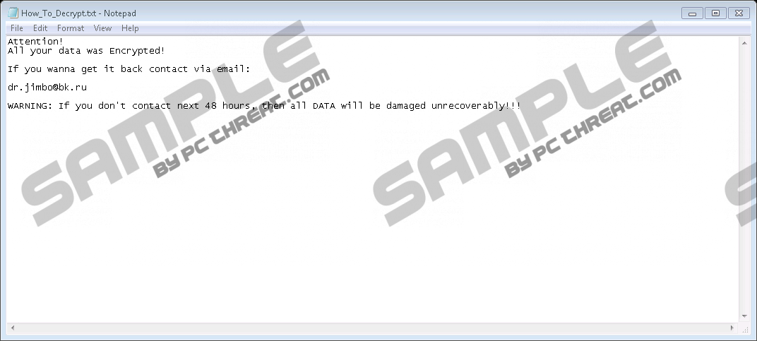 Dr Jimbo RansomwareDr Jimbo Ransomware is a very dangerous malware that it capable of irreversibly damaging your files. It is set to encrypt the files using a complex encryption algorithm that in impossible to crack without a decryption key and the only way you can get this key is by paying the ransom its developers ask. However, we advise that you remove this infection because it is likely that you will not receive the promised key. We have tested this ransomware on our test PC and found some interesting things about it which will help you get a better understanding of what you are dealing with. Let us begin with this infection’s origins. Our research has shown that it comes from an individual or group that is probably based in Russia or one of its neighboring states. We assume that this is the case because the cyber criminals want you to contact them via an email address provided by a Russian email service provider. The address is dr.jimbo@bk.ru. However, this infection’s scope of dissemination is not limited to the Russia as it is an internationalized infection. We say this because its ransom note is written in English. Since this infection is new, not much is known about it, and its infection rates are low. We think that this is because its developers are getting ready to release another newer version. Like most ransomware, Dr Jimbo Ransomware is sent in email attachments. It appears that its developers have set up a server dedicated to sending spam mail containing this infection. We think that those emails contain an archive which might be a self-extracting archive, but it could also be a regular archive since testing has shown that it does not copy itself to a different location once you launch it manually. Therefore, the location of its files should be there where you set it to do download. Note that it comes as one executable file that is named randomly with not distinguishable traits, so you will have to identify it manually or use an antimalware scanner such as SpyHunter to identify it for you. If your computer becomes infected with Dr Jimbo Ransomware, then this ransomware will scan your computer for files to encrypt and then encrypt all file formats in all locations except in %WINDIR% so that your computer remains operational and you are able to use it to pay the ransom. We think that this ransomware uses some variant of the AES encryption algorithm to encrypt the files, but a more in-depth analysis is necessary to confirm this. In any case, there is no doubt that its encryption algorithm is complex, and you cannot decrypt the files using third-party tools. Thus, your files might be damaged irreversibly. However, we do not recommend that you contact the cyber criminals and pay whatever the amount of money they ask for because they might not keep their word and send you the decryption key. It should be mentioned, however, that the ransomware developers threaten you with damaging your files beyond repair if you do not contact them within 48 hours after the infection took place, but again, you should not allow them to bully you into submission. While encrypting your files, Dr Jimbo Ransomware will add a file extension .encrypted to each file and create a .txt file in each folder where a file has been encrypted. It should be noted that it creates a main .txt file in %HOMEDRIVE% and creates a Windows Registry key in HKCU\Software\Microsoft\Windows\CurrentVersion\Run with the Value name Happy Letter whose Value data is %HOMEDRIVE%\How_To_Decrypt.txt. Thus, this ransomware is set to open the ransom note on system start up. Also, this infection will not lock the screen or block the Task Manager so that you can delete it without obstructions. In closing, Dr Jimbo Ransomware is a dangerous computer infection that can encrypt your files and render them useless if you do not have the adequate means to prevent the infection. Paying the ransom is not recommended especially if they ask for a substantial sum of money. Therefore, we suggest that you just remove this ransomware using the guide found below. How to delete Dr Jimbo Ransomware