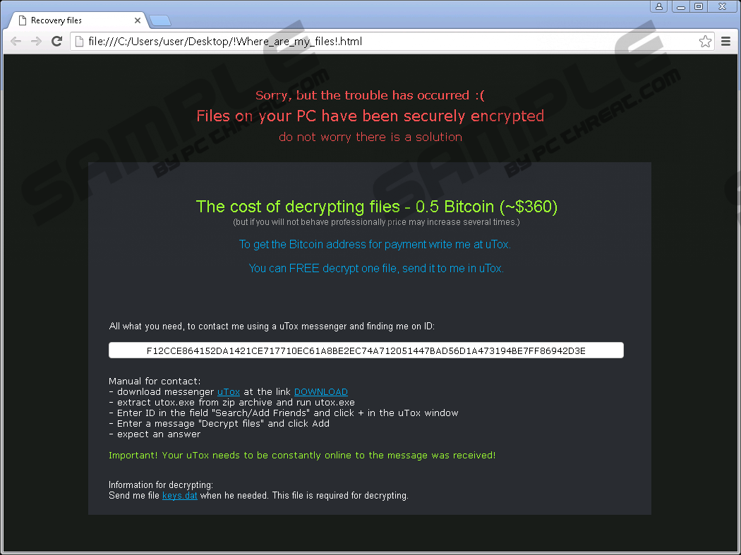 CryptoRoger RansomwareCryptoRoger Ransomware is a dangerous infection that can enter your computer via email spam and encrypt your files making them utterly useless. It goes without saying that you have to remove it to continue using your computer safely. Unfortunately, there is no way you can decrypt the encrypted files without the necessary decryption key. This ransomware’s developers offer you to purchase the said decryption key, but they ask for a lot of money and the files on your system might not be worth it. Also, it is likely that they will not even send you the key, or you might not receive even if they send it to you. In short, many things can go wrong when trying to acquire the decryption key which should also come with a dedicated tool. The developers of this malicious software have opted for the most popular distribution method used to infect the computers of the unsuspecting victims. Of course, we are referring to email spam which is the most popular distribution channel due to its high successful infection rates. Many people accidentally get their computers infected with the likes of CryptoRoger Ransomware because they open attachments containing it. This particular infection is supposed to come in a file archive that contains its main executable. The executable may be renamed and disguised as, for example, a PDF file or a Word document. Indeed, ransomware developers have the skills to do this. Once on your computer, this ransomware will not copy itself to a hidden location but run from the directory you downloaded or extracted it to. This is essential when removing this infection because its executable is the most important file. According to our research, once on your computer, CryptoRoger Ransomware will scan it and encrypt almost file formats and add the .crptrgr file extension. It will also create an .html file named !Where_are_my_files!.html in every location that contains an encrypted file. We have discovered that this ransomware uses the AES-256 symmetric encryption algorithm to encrypt the files and the RSA encryption algorithm for encrypting the key needed to decrypt the files. So the key is already present on your system, but you do not have access to it as it is also encrypted. The file that contains this key is keys.dat which found in %APPDATA%. Also, it creates two other files named bg.jpeg which is set to replace your desktop wallpaper and files.txt which contains the complete list of all encrypted files. Once CryptoRoger Ransomware has finished encrypting the files it will create a registry key at HKCU\Software\CryptoRoger which contains some unrecognizable data. Nevertheless, you have to delete this key along with the executable and additional files. Furthermore, after this malware has completed encrypting your files and generated the !Where_are_my_files!.html file, it will demand that you pay a ransom for getting the key to decrypt your files. The ransom note states that the developers want you to pay 0.5 BTC or $360 USD. To get the address to which to send the Bitcoins you have to contact them via uTox, a Tor messaging service. uTox must be running for the developers to send you the decryption tool and key if you decide to purchase it. So if you are offline, then you will not receive them. Also, the developers might not send you them at all once they have gotten your money. All in all, CryptoRoger Ransomware is a very dangerous infection that will render your precious files useless. The only way you can protect your system from it is by installing an anti-malware program. We recommend SpyHunter as it can detect and prevent CryptoRoger Ransomware from infecting your PC. It can also assist in removing it. Nevertheless, you can try to delete its files manually, but you have to know the exact location of its executable. Removal Instructions