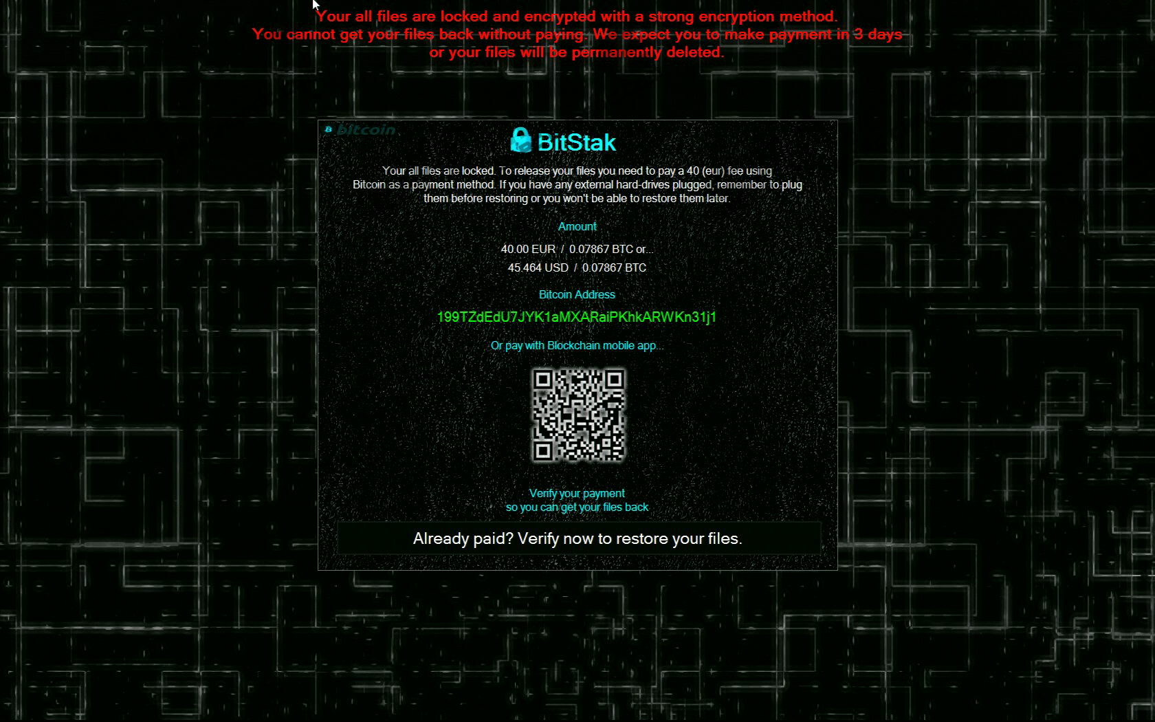 BitStak RansomwareIt might be frightening to see a screen-sized notification on your desktop, but if this notification requires you to pay money for file decryption, you should not be that quick to click anything. We believe that you have been infected with BitStak Ransomware. This malicious infection will try to make you think that you have no other way to retrieve your files, but to pay. Luckily, that is a blatant lie, and you should not succumb to the infection’s demands. Remove BitStak Ransomware from your system and do everything you can to avoid similar threats in the future. After all, your computer’s security should be your utmost priority. This infection differs from most of the other ransomware applications we have to deal with because it already has a decrypter. The tool can be found on a number of computer security-related websites. As long as you use “BitStak decrypter” for your search engine query, you can be sure that you will find this application. Does it mean that you can leave this program be, though? No. Absolutely not. And in order to terminate this infection, we believe, you need to find out more about what it is and how it works. For starters, let us begin with the distribution method that is applied by this infection. Just like most of the ransomware programs, BitStak Ransomware travels around via spam email attachments. It means that you initiate the installation of this program yourself, and, most probably, you do not even realize that. Have you opened some email attachment recently? Was your screen locked by this program immediately after that? If so, you know where to look for the ransomware installation file: You clearly need to delete it from your Downloads folder. Also, staying away from unfamiliar email messages would also help you avoid getting infected. Some of the spam messages that are part of the ransomware distribution network may look like notifications from legitimate financial institutions, but you should know that banks and other companies seldom ask you to download and install anything. They definitely do not send documents by email, so that should already raise the first red flag for you. If, unfortunately, BitStak Ransomware entered your computer, the ransomware will run a full system scan to locate files that have such extensions as .jar, .mp3, .wav, .save, .mp4, .cfg, .flv, .php, .com, .txt, .doc, .exe, .dat, .bat, .vb, .zip, .7z, and others. These are the files that the ransomware can encrypt. It will look for those files in such directories as Program Files, AppData, User Documents, Videos, Music, Pictures, and so on. The program will locate all the files that it can encrypt, and it will scramble their data information in a way that they will no longer be readable. The infection will also change the names of the files, adding the ransomware extension. For example, a document.doc could be renamed to WÖU.fPf.bitstak. Imagine that: You open your computer, and you can no longer access your files. It sounds terrible, does it not? On top of that, the infection also displays a message that colors your screen black and reads: