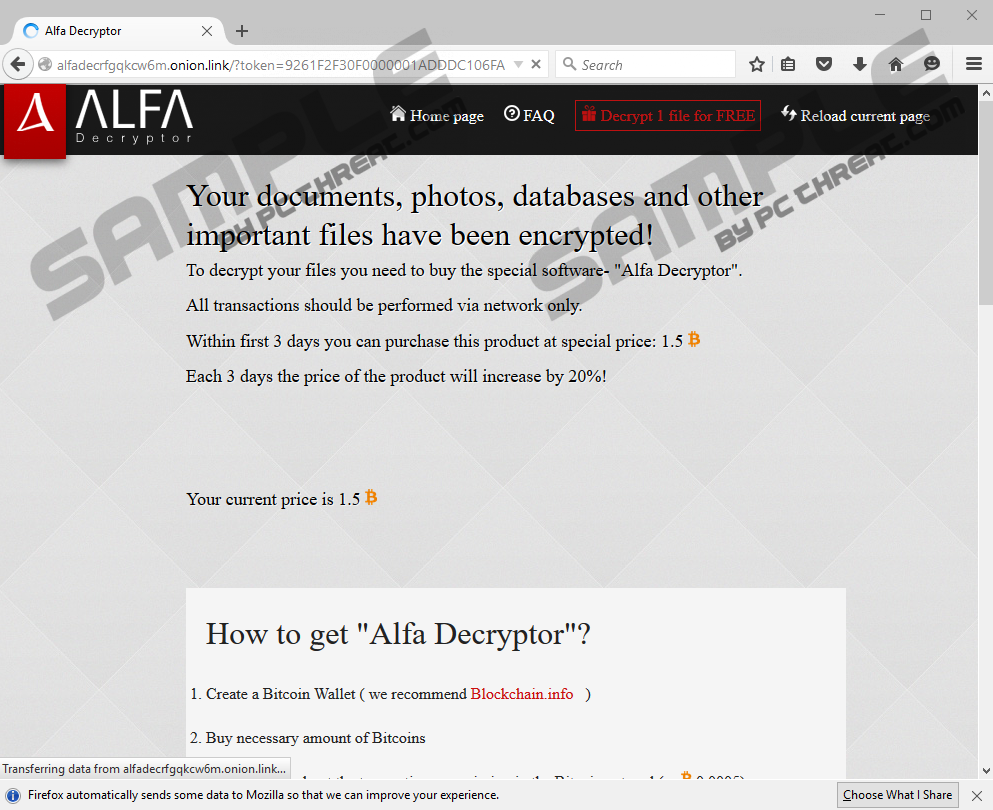 Alpha RansomwareAlpha Ransomware is a very dangerous computer infection that might become your worst nightmare if it ever enters your computer. Researchers at pcthreat.com have closely inspected this threat and have found that it has been created by cyber criminals who are responsible for developing Cerber Ransomware (this infection was popular some time ago), which suggests that they share similarities. It is evident that they both lock files and seek to extort money from users; however, what users do not see is that there are similarities in the source codes of these two ransomware infections too. Our researchers know everything about Cerber Ransomware, so they suspect that it will not be easy to decrypt files encrypted by Alpha Ransomware as well. Unfortunately, it will not be easy to erase it from the system either; however, we are sure that it will be easier for you to delete this threat from your system if you read this article. Ransomware infections encrypt files they find on computers and then ask users to pay money for the decryption key. Cyber criminals know that it will be difficult to swindle computer users out of cash. Therefore, a reason to pay is given for them, i.e. to get the decryption tool. Unfortunately, it seems that Alpha Ransomware encrypts the majority of files it finds on the system. It is even targeted at such valuable files as videos, music, pictures, and documents. If you have files with the following extensions on your PC, you will quickly understand that the ransomware has found a way to enter your computer because they will all be locked: .3gp, .pct, .mp3, .mp4, .kdc, .mpg, .mrw, .nef, .nk2, .xlk, .tga, .thm, .pptx, .xlsb, .rtf, .m4v, .eml, .mdb, .jpe, .cer, .nd, .c, .h, .m, .ai, .dng, .doc, and others. Not all the files will be encrypted, for example, it will not touch those located in the %WINDIR% directory; however, you could easily recognize those encrypted files because they will all have a new filename extension .bin assigned to them. Once Alpha Ransomware is finished with personal files, it creates two files README HOW TO DECRYPT YOUR FILES.html and README HOW TO DECRYPT YOUR FILES.txt and opens the .txt file on Desktop. Users are told that their files are encrypted, and they need “the special decryption software” also known as Alpha Decryptor to unlock their files. It would be naïve to expect that the tool is free. As our specialists have noticed, this infection asks users to pay a ransom of 1.5 Bitcoin (approximately $995) within 3 days. It is also said that “each 3 days the price of the product will increase by 20%” in order to convince users to make a payment without consideration. Even though cyber criminals push users into purchasing the decryptor, our specialists say that you should not spend money on a tool which you do not even know whether will really be sent to you. At the time of writing, it is impossible to decrypt files free of charge unless you have made a backup before the entrance of this computer infection. If you do not have copies of your important files, you should wait for the free decryption tool to be released. It should be developed by specialists sooner or later. If you do not erase Alpha Ransomware from your computer soon, it will launch again and encrypt new files you create. Yes, it is capable of starting with the Windows OS, so it will be automatically opened each time you reboot your computer. Specialists have not found this surprising at all because they have already noticed that this ransomware infection creates the Value in HKEY_CURRENT_USER\SOFTWARE\Microsoft\Windows\CurrentVersion\Run with the Value Data C:\Users\user\AppData\Roaming\Microsoft\Essential\msestl32.exe. Delete the threat to make those modifications gone. Alpha Ransomware has to be deleted from the system ASAP to protect future files. Also, you could use the computer without any fear again. As you already know, your files will not be unlocked if you get rid of this infection; however, it would be a very bad idea to let the ransomware stay. This threat can be erased either manually or automatically. Of course, it is easier to get rid of such serious computer infections automatically; however, if you still decide to go for the manual Alpha Ransomware removal, you should use the manual removal guide written by specialists working at pcthreat.com. Scroll down to find it. Delete Alpha Ransomware from your computer