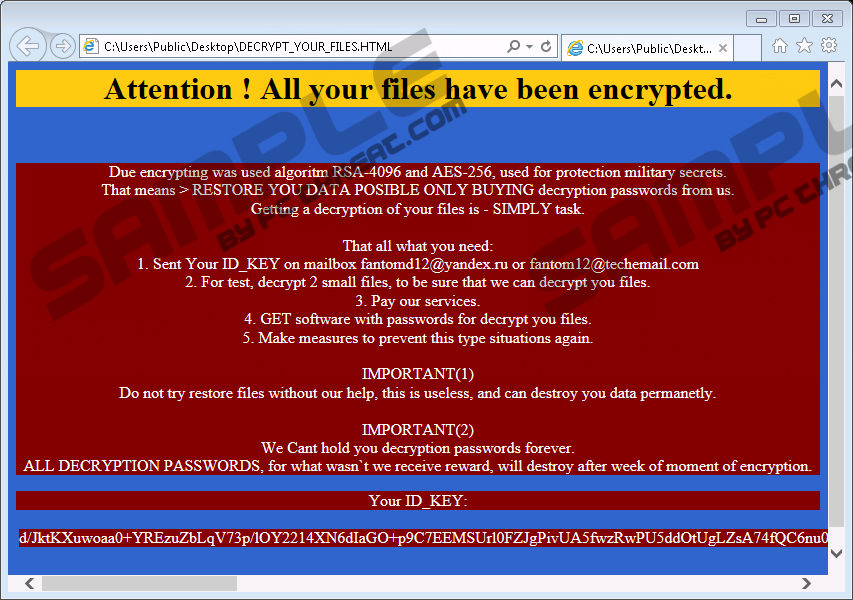 Fantom RansomwareFantom Ransomware is a ransomware application, and this new infection has been released with the intention to rip you off. Of course, it will not log your keystrokes and steal your personal information. Instead, it will try to force YOU to transfer the money to the given account. This is definitely very annoying and obnoxious, and you should not tolerate such behavior. The thing you have to do is remove Fantom Ransomware from your system immediately. While you are at it, you can also scan your computer with a reliable security tool, in search for other unwanted and dangerous applications. Although there is nothing good about ransomware programs, we should still be grateful they are not as stealthy as Trojans or worms. They do not try to remain hidden for as long as possible. These programs will let you know of the infection immediately. The ransomware program will display a notification that says all your files have been encrypted. This is the default message that most of the ransomware apps display. On the other hand, the text within the ransom note may differ according to the type and size of the infection. For example, in our case, Fantom Ransomware says that following: