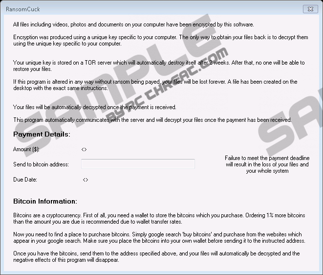 RansomCuck RansomwareRansomCuck Ransomware may become a dangerous threat to your computer and your files, but the first version that just hit the web seems to be a semi-ready product indeed. This ransomware is based on the well-known Detox Ransomware, but for some unclear reasons it fails to do its job, i.e., it does not actually encrypt your files. It is possible that a new variant will soon emerge and will be more consistent and deadly. So it is best to share what we can know now about this malware infection so that you can be prepared to avoid it if possible. As you may know, ransomware threats are one of the most dangerous infections as they can encrypt your files, which you may lose all in such an attack. Of course, this is all about your money; in other words, extorting money from you to get the decryption key or software or both. Since this infection does not encrypt your files, at least you have a chance to restore your computer and its system security if you remove RansomCuck Ransomware right now. We are here to help you with the necessary steps but first let us talk about what we have learnt about this malware program. The most likely way you can infect your machine with this ransomware is through spam e-mails, but, of course, new versions may show up that could also spread via Exploit Kits as well. For this reason, you should make sure that all your browsers and drivers (e.g., Java and Flash) are updated frequently because Exploit Kits, as you can guess from the name, can exploit older versions’ security holes to infect your computer. But let us see now how a spam e-mail can hurt you. Such a mail can evade your spam filter and end up in your inbox. However, not only can it deceive your filter, but it can also convince you that it is urgent and important for you to open it as well as download and view the attached file. This attachment is usually disguised as an image (.jpg or .bmp) or a text document (.docm) with macro. Running this file equals to activating RansomCuck Ransomware in fact. You may believe that you are about to see a complaint about wrongly given credit card details, a mistaken flight booking, or a picture of an unsettled invoice, but, unfortunately, you simply initiate this attack. Although your files may not be harmed by this version, you should delete RansomCuck Ransomware immediately because this can change very soon. We have found that this ransomware does not appear to communicate with any C&C (Command and Control) servers, which means that this infection does not encrypt any files as of yet. From the source code we assume that this malware program targets the usual image, video, database, and program files and is supposed to add the ".encrypt" extension. Once the alleged encryption is finished, the ransom note ("RansomCuck.txt") comes up on your screen. At the same time, this infection also disables the Windows Registry editor, the Command Prompt, and the Task Manager thus making your attempt to remove RansomCuck Ransomware more difficult. From the ransom note you learn that your files have been encrypted and your only chance to recover your files is to get the unique decryption key that is claimed to be stored on a TOR server. This key is said to be destroyed after 2 weeks if you fail to transfer the ransom fee. Probably due to the missing communication with the server, there is no amount and no Bitcoin wallet address provided in this note; therefore, it would be hard to comply with the instructions. So, in this case, there is no reason to even consider paying these crooks anything since your files are not even encrypted as a matter of fact; if you get hit by this first version that we tested. There is only one thing you should do: Remove RansomCuck Ransomware as soon as possible. Since this ransomware makes certain Windows Registry changes, it is a bit complicated to eliminate it. We try to explain the steps so even inexperienced users could be successful following them. However, if you do not feel confident about manual removal, you may want to ask a friend or go for an automated solution. First of all, you need to find and download a reliable third-party Windows Registry Editor program because your built-in editor is disabled and so are your Task Manager and the Command Prompt as well. Second, you need to kill the malicious process via Task Manager and then, go on deleting the malicious files and registry entries related to this attack. Please follow the instructions we have included below this article to make sure you clean your system of this annoying threat. Another more comfortable choice you also have is to download a trustworthy anti-malware program, such as SpyHunter, and let it do its job automatically. This security tool will also protect your system from future malware infections. If you are looking for peace of mind while surfing the web, this could be your best solution. How to remove RansomCuck Ransomware from Windows