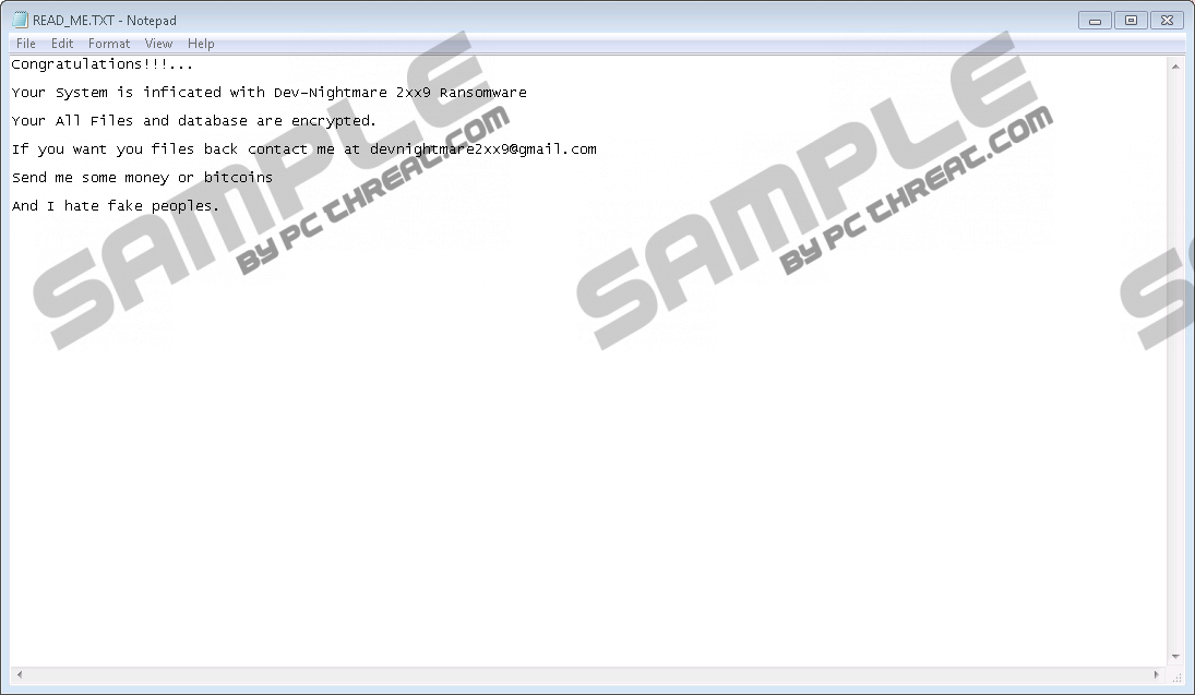 DevNightmare RansomwareDevNightmare Ransomware is a malicious application recently detected by experts. Even though it is a new member of a large family of ransomware infections, we cannot say that it is unique in any sense. In other words, it does not differ from other ransomware infections created by cyber criminals. Researchers working at pcthreat.com have noticed that DevNightmare Ransomware also encrypts files. In addition, it creates a new file on Desktop after it finishes doing that. Like other threats that fall into the category of ransomware, cyber criminals have created it to reach more people in order to obtain money from them. We understand users who need their files back, but we do not think that it is a good idea to pay money for the private decryption key too because cyber criminals who have created this infection might not send it to you after they receive the money they wanted. It might be extremely hard, or even impossible, to decrypt files without the private key because this ransomware infection uses the AES-256 encryption algorithm; however, there might be other ways to recover files, so do not worry and continue reading this article. Research carried out by our specialists has also shown that DevNightmare Ransomware is based on the Hidden-Tear, which is known to be open-source ransomware. Its code has been made public due to educational purposes; however, cyber criminals have decided to create their own ransomware to extort money from people. In order to do that, DevNightmare Ransomware encrypts the most valuable files it finds on the computer, e.g. music, pictures, and documents by adding the extension .2xx9. Then, it places the READ_ME.TXT file on Desktop. It does not contain much information, but it becomes immediately clear after reading it that cyber criminals want money from users: