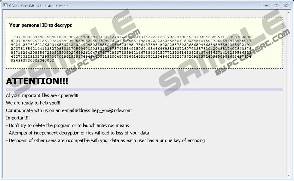 Help_you@india.com RansomwareHelp_you@india.com Ransomware will not help you at all. In fact, it will do the opposite of that because it is designed to encrypt your files and demand that you pay money for the decryption tool. However, you should refrain from paying the ransom because its developer might not give the decryption tool once you have paid. Therefore, we advise that you remove it from your PC altogether, but before we move on to that part, we want to tell you a bit more about this malicious application, so if you want to find out more, then please continue reading. Our research has revealed that revealed that Help_you@india.com Ransomware is disseminated using email spam. Its developer has set up an email address that sends the emails to random people and by opening the file attached to it your computer will become infected with it. The emails do not contain much text, and the text that is in there is set to encourage you to open the attached file archive. We think that it features a Microsoft Word Document disguised as an invoice that, when opened, will show distorted text and the letters in red will ask you to enable macros to show the text in the correct encoding. If you enable macros, then this file will initiate the download of this ransomware’s main executable files. However, you should take note that the file is named randomly, so finding it on your PC would be like searching for a needle in a haystack. Nevertheless, we have found that Help_you@india.com Ransomware’s executable is most likely dropped in one of seven locations that include but are not limited to %ALLUSERSPROFILE%\Start Menu\Programs\Startup and %APPDATA%\Microsoft\Windows\Start Menu\Programs\Startup. Once on your computer, this ransomware will run automatically and scan it for files of interest. To our knowledge, it can encrypt hundreds of file types that include .dat, .aac, .ogg, .jpeg, .jpg, .tif, .xml, .txt, and many others. It is designed to use the AES-256 encryption algorithm to encrypt the files, and there is currently no free decryption tool to get your files back for free. However, paying the ransom is not an option you should consider because if the ransomware developer wants you to pay a lot of money, then it might be uneconomical to do so. Also, you might not receive the decryptor. Once the encryption is complete, Help_you@india.com Ransomware is set to drop a file named how to restore files.hta which is a ransom note, in fact. The note says that you need to contact the developer via the provided email address Help_you@india.com. It says that using a third-party decryption tool will corrupt your files and his is true. Therefore, only a decryptor dedicated for this particular ransomware can get your files back. Alas, such a tool has not been made yet, and there is no way of knowing if it will. However, paying the ransom is risky because the developer might not keep his/her end of the bargain, and we suggest that you delete it because of that. There is no question that Help_you@india.com Ransomware is a dangerous ad highly malicious program. It is distributed via fake emails and one on your PC will encrypt many of your most important files. Its developer wants money in return for your files but you should not out your faith in the decryptor promised for you because you might not get it. We recommend that you delete this ransomware’s main executable along with its additional files and registry keys. Feel free to use your guide or use SpyHunter to remove it for you. Remove this ransomware manually