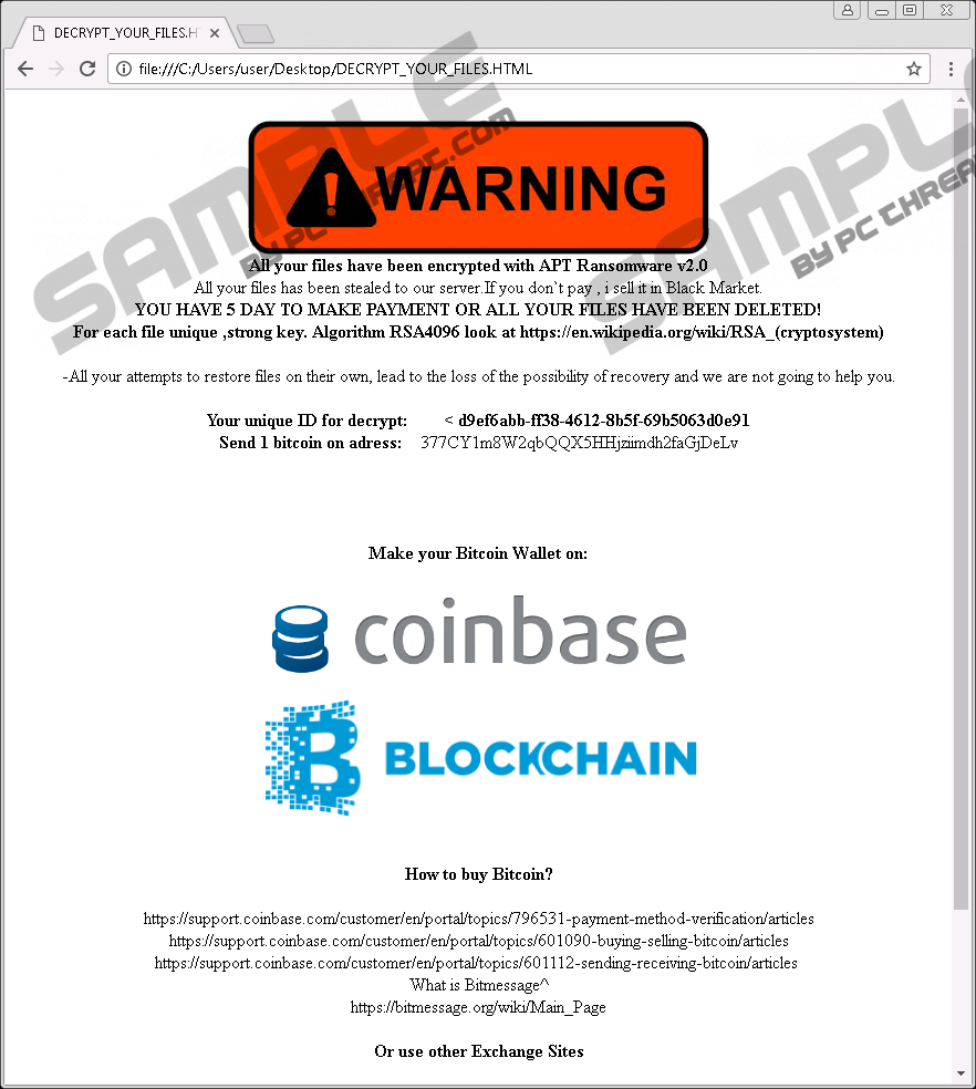 APT RansomwareYou are in big trouble if the devious APT Ransomware slithers into your operating system because this infection can encrypt your personal files (you will see “.dll” attached to them). The worst part is that this threat appears to have been created by cyber criminals who are not even willing to release your files. According to the research conducted in our internal lab, it appears that the ransomware is unable to decrypt your files, which, of course, means that once this threat is in, your files are gone. Although the ransomware does not delete the files, it changes their data using the AES 256 algorithm, and that makes your files unreadable. We have found how this threat is proliferated, and we know how it works. If you want to learn more about that as well, you should continue reading this report. Also, keep reading if you want to remove APT Ransomware from your operating system, which, of course, is crucial. According to our research, the devious APT Ransomware spreads mainly via spam emails. The launcher of this dangerous threat is likely to be represented as a document file or a picture, and you might be tricked into opening it because of the information attached to the spam email. In the past, we have seen cyber criminals pretending to represent airlines, postal services, banks, and similar institutions. They are even capable of creating email addresses that look authentic, which can help trick users. Unfortunately, once the launcher is opened, the victim might not notice anything suspicious. Of course, the content that you expect to see by opening the file will not appear, which, of course, is a red flag. Unfortunately, even if you notice that something is not right, it is unlikely that you will be able to stop APT Ransomware. Deleting the malicious launcher right away is the only thing that can help, and you are unlikely to figure that out in time. It was found that APT Ransomware was created using the open source ransomware project that goes by the name “HiddenTear.” 8lock8 Ransomware and GhostCrypt Ransomware – infections that we have reported in the past – were both created using the same project. It was found that APT Ransomware – and possibly, other infections that belong to the HiddenTear group – can remove Shadow Volume copies, which reduces your chances of getting your files back. Some users set up a restore point to prevent the loss of data in cases like this one; however, the ransomware uses the “vssadmin delete shadows /all” command to delete Shadow Volume copies. All of this should leave the user with no other choice but to pay the ransom that is requested from them, but, as our researchers have found, the ransomware does not send a key to C&C servers, which makes the decryption of the files impossible. Unfortunately, there is no way for regular users to know this unless they research the ransomware first. The DECRYPT_YOUR_FILES.HTML file is created by APT Ransomware to represent the demands. According to these demands, you need to pay a ransom of 1 BTC (~630 USD) within five days and confirm the transaction by sending your Bitcoin Wallet ID and your unique ID to the provided Bitmessage address, 2cX4MWcTFbmKgPQX1irMiDsU84dXB6LFBv. Cyber criminals threaten to delete all files if the payment is not made within 5 days, but, as you now know, there is no point in paying the ransom. Although your files will not be removed, they will remain unreadable. Hopefully, you have them backed up; otherwise, there really isn’t much you can do. You might have to resign to losing them. You can remove APT Ransomware manually or you can install an automated malware detection and removal tool. If you are not ready or experienced to inspect your own operating system, clean it from threats, and protect it against the invasion of malware, it is a good idea to install anti-malware software as soon as possible. If you think you can handle everything yourself – which, by the way, is a challenge for even highly experienced users – you might choose to follow the manual removal guide displayed below. The biggest struggle you might face is identifying the malicious ransomware launcher, as well as other active threats. If you are unable to do that yourself, install a legitimate and up-to-date malware scanner. APT Ransomware Removal