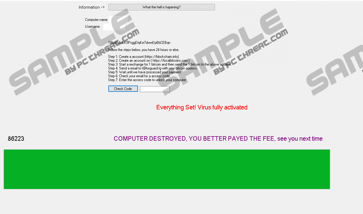 Screenlocker Hacking18Screenlocker Hacking18 seems like a dangerous threat on a trial round. This means that although this Trojan screen locker could cause you a lot of harm by, for example, encrypting your most important personal files, it simply locks your screen. Of course, it tries to extort money from you so that you can unlock your computer, we must tell you that it is possible to put an end to this threat and restore you computer. All you need to do is restart your computer and remove Screenlocker Hacking18 from your system as soon as possible. We have included instructions for you at the end but before you jump there, we would like to share with you how this malicious infection can infiltrate your system and how it works so that you can defend your computer in the future from similar dangers. In order to be able to safeguard your system from malicious threats like this, you need to realize how it is possible that this Trojan has managed to show up like an uninvited guest. User reports indicate that the main channel for this infection to be distributed by is via spam e-mail campaigns. Most users believe that just because their e-mail server is protected by a spam filter it means that they are all secure. However, the sad truth is that such spam mails may be able to avoid detection or even if they end up in your spam folder, you would most likely want to open them. The reason behind their success is no secret: These spam e-mails use deceptive tactics to fool your filter and you as well. It is quite possible that by looking at such a spam mail you would not see that it is fake or malicious. Mostly, because such a mail usually appears to have come from the police or other authorities. The subject of this mail can be anything that could look important to you, for example a flight ticket booking that went wrong, an undelivered parcel, an unsettled fine, and so on. It is quite obvious that most people could not resist this kind of temptation and this is exactly what these criminals rely on to infect you with Screenlocker Hacking18. As a matter of fact, opening this spam mail is not the worst you can do. Although there are certain infections that can be triggered by clicking on a spam mail, this Trojan screen locker most likely infects you after you download its attachment and try to view it. In order for you to want to open this file, the body of this spam mail tries to convince you that there is an urgent matter you can have details about if you open the attached file. This attachment can be disguised as a normal image, video, or text file. Since it is this simple to infect your computer with such a malicious program, we suggest that you only open mails that are surely related to you. But even if you open a questionable mail, make sure that the attachment was meant for you to get. Another solution for you to protect your system in a more efficient way is to install a reliable malware removal application that not only could delete Screenlocker Hacking18 automatically but your PC would also be fully protected from all existing malware programs. Once this infection starts up, it creates a Run registry entry so that it can autorun when you reboot your system. This Trojan screen locker also blocks your Task Manager so that you cannot easily end its malicious process, which would obviously unlock your computer. When it is finally ready to strike, this malware locks your screen and on top of all active windows it displays its warning window, which we can also call a ransom note actually. This window has a fake progress bar at the bottom that pretends to show you the progress of the destruction of your files. When all is set up, you can see that the "virus fully activated" and that your "computer destroyed," which are supposed to frighten you. Since you cannot seem to close this window or get it out of the way unless you are using Windows 10, of course, you may believe that the only way for you to recover your system is to pay these cyber criminals. You also find instructions on this locker screen that inform you that you have to pay 1 Bitcoin, which is approximately 690 US dollars. Once you transfer the money, you have to contact these crooks via e-mail (t@torgourd.tg) and you will supposedly get an unlock code that you can use on this window to unlock your computer. But the good news is that there is a way around. You do not have to pay this money because we can tell you how you can delete Screenlocker Hacking18 from your computer. Fortunately, this Trojan seems to be created for sale or trial purposes; therefore, it does not really destroy your files. We do advise you, though, to take this seriously and consider making regular backup copies to a cloud storage place or a removable drive. If you are using Windows 10, all you need to do is use the Alt+Tab key combination to change the active window and then, you can simply close this malicious window. Once you get this screen locker out of the way, you can take care of its related files. However, if your system is an earlier version, you need to restart your PC in Safe Mode before you can do anything. Please use our guide below if you feel up to the manual removal of Screenlocker Hacking18. Hopefully, you see how important it is to protect your operating system and the files you store on your hard disk. Anyone can let their guards down from time to time and click on corrupt content even accidentally. This is why we believe that the best way to defend your precious computer is to use a professional anti-malware program. Restart your PC in Safe ModeWindows XP/Windows Vista/Windows 7