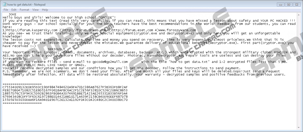 GPCode RansomwareYou might be wondering what is happening with your operating system when a text message appears mentioning the “GPCODE school.” Well, this is a sign that GPCode Ransomware has entered your PC. This dangerous ransomware is very quiet, and most users realize that it is active only when the TXT file is created to introduce them to the ransom demands. Unfortunately, when this file is created, there is no way to stop the encryption process. Speaking of the process, it appears that the infection employs the AES algorithm to encrypt your files, and then it uses the RSA algorithm to encrypt the key that you need for the decryption. It is most likely that the decryption key is sent to a remote server, and so retrieving it yourself is impossible. In fact, our research team warns that a third-party decryptor capable of cracking the algorithm is unlikely to be created as well. This means that if the ransomware encrypts your operating system, it might be too late to save your files. Of course, there is one thing that cyber criminals want you to do before you remove GPCode Ransomware. According to our malware researchers, GPCode Ransomware can be infiltrated by exploiting operating system and Remote Desktop Protocol (RDP) vulnerabilities. Some victims have reported that the vicious ransomware slithered in as they opened infected spam email attachments. If this is how the ransomware entered your operating system as well, you must figure out where the attachment was downloaded because this is where the malicious .exe file that requires removal might be located. Of course, you should not rush to delete this file before you read the report. The damage has been done, and there is no need for rushing. Needless to say, that does not mean that you should postpone this task indefinitely because it is still a piece of malware, and you do not want it on your operating system. Once the encryption is complete, you will find that most files on your PC – including .exe files, but excluding all files in the %WINDIR% directory – are locked. Once the files are encrypted, you will not be able to read them, and that is what is meant to push you into paying a ransom. Note that even if you do, the malicious GPCode Ransomware will remain present, and so you should not forget about its removal. The files encrypted by GPCode Ransomware should have the “.LOL!” extension attached to them. In some cases, the files are appended with the “.OMG!” extension instead. Because the infection corrupts the most sensitive files, it is very likely that you will at least read the information represented via the “how to get data.txt” file. The message informs that your personal files were encrypted for educational purposes, to get you more informed about ransomware and virtual security. Obviously, that is just a sad excuse for devious cyber criminals to get your money. If you follow the demands represented in this message, you will send an email to gpcode@gp2mail.com with the TXT file attached to it. This file includes a code that identifies you, and that is how the right decryption key should be provided to you. Now, there are absolutely no guarantees that a decryption tool or key would be given to you even if you paid the ransom fee, which is exactly what you will be ordered to do once the cyber criminals respond to your email. You should not get your hopes up if you decide to take the risk of paying the ransom, and – regardless of the outcome – do not forget to delete GPCode Ransomware. The malicious GPCode Ransomware uses one single file to encrypt your files and create a TXT file with the ransom message, which makes the removal process very simple. Of course, if you are unable to identify the malicious file – and it might have a misleading name – you might find the process very difficult. What is more, you might not be able to find the malicious file if it removes itself right after the encryption is completed. Because the situation is a little messy, we advise using a malware scanner to inspect your PC. Well, what should you do if your browsers were encrypted as well? If that is the case, you can download the browser’s installer on a different PC and transfer it using a flash drive. Hopefully, you will be able to transfer your files from a backup drive using the same method. If you have not backed up your files, we hope that you will look at this more seriously once you remove GPCode Ransomware. GPCode Ransomware Removal
