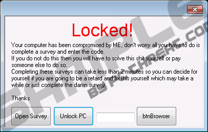 SurveyLocker RansomwareIf your operating system was attacked by SurveyLocker Ransomware, it is most likely that you have recently opened a malicious file represented via a spam email. This is how most ransomware infections are spread across the web, including such recently reported threats as Cockblocker Ransomware and Santa_helper@protonmail.com Ransomware. In most cases, malicious ransomware threats are capable of encrypting files and demanding ransom fees. In this case, the ransomware works as a screen locker, and it does not lock your personal files. That is good news, but that does not mean that you can underestimate this malicious threat. Our research team strongly advises removing SurveyLocker Ransomware from your operating system as soon as possible. You can learn how to delete this threat successfully by reading the report and following the instructions represented below. When SurveyLocker Ransomware strikes, it locks your screen, which blocks your access to the entire operating system. Right away, a message appears indicating that your PC was locked and introducing you to instructions that explain how to unlock your operating system. Here are a few excerpts.