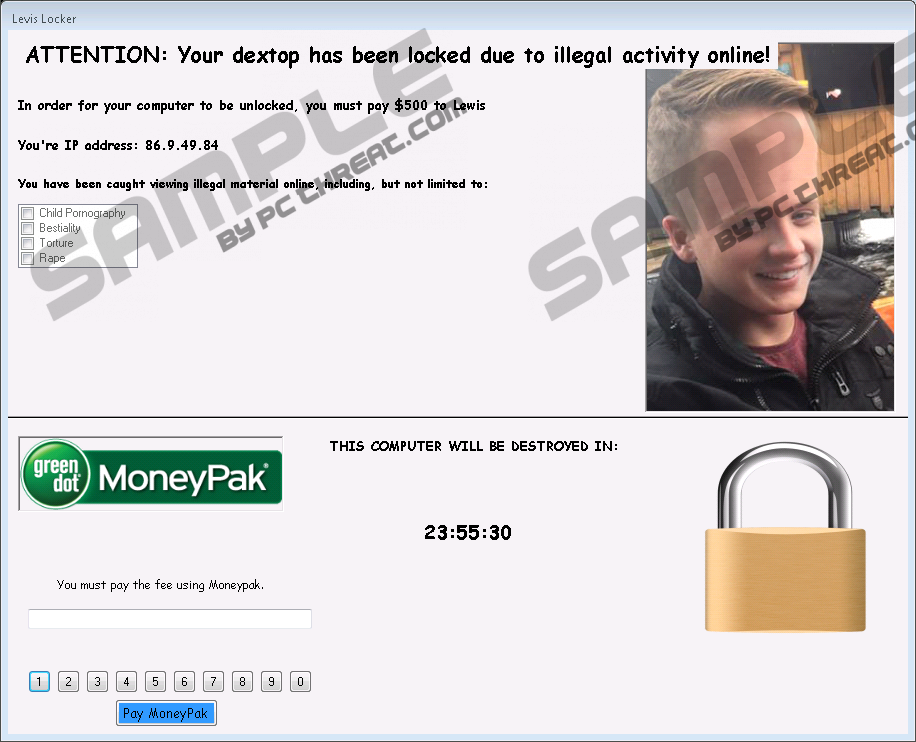 Levis Locker RansomwareLevis Locker Ransomware is a malicious program that you should never have active on your personal computer. This is so because the dubious program might be able to cause harm to your personal data. In some instances, it might even corrupt your personal files. On top of that, the devious program is known to use scare techniques to lure money out of unsuspecting internet users. To understand how all of this works, make sure to read the rest of our article as we provide information that has been discovered by our malware experts working at our internal labs. In addition to such information, we present a detailed removal guide that will allow you to completely delete Levis Locker Ransomware along with a few preventative steps that will help you keep your PC safe and secure at all times. Levis Locker Ransomware does not work like a majority of its counterparts. Upon further investigation, our researchers have discovered that unlike the majority of ransomware programs, the one in question at the moment does not affect your data. While this is a good thing, you should know that its functionality might change any day and your files could get encrypted. Thus, it is not surprising that it is imperative to delete this malicious piece of software as soon as possible. While it might seem that there is nothing to worry about, you should know that developers of this ransomware use manipulative techniques to scare users into paying a ransom. Basically, once the malicious program is launched, you will be presented with a pop-up window blocking access to your desktop. Within this warning message, you are informed that your PC has been blocked and that you will need to make a payment of $500 to regain full access to it. According to the warning, this happened because you were viewing illegal content online. While this might sound convincing, you should know that it is nothing but a hoax. Do not waste your money and make sure to delete Levis Locker Ransomware in its entirety. This way you will regain full access to your PC and will be sure that a program which might be capable of comprising your data is no longer active on your operating system. Get rid of this devious application by following the instructions that we provide below. During the analysis of Levis Locker Ransomware, it has been discovered that in quite a few cases this malicious program is spread via spam e-mail attachments. Thus, it should not come as a surprise that our research team highly advises you to avoid all e-mail attachments coming your way from unknown senders at all times. This way you will be able to avoid any potentially malicious program spread in such a way. Also, we advise every Internet user to practice safe browsing habits as there is a possibility to infect your PC just by entering a suspicious third-party website since they could be embedded with arbitrary code execution exploit. It is crucial to avoid such web pages since your PC might end up infected with dubious software. Additionally, we recommend downloading your programs from official vendors' websites only since they are known to provide clean installers, unlike the unauthorized third-party download sites, which are infamous for being the primary source of bundled installers. Lastly, but most importantly, make sure to install a professional antimalware tool if you do not have one already. Such a tool is critical since it provides overall system security at all times. Make sure to take these preventative steps since they will help you maintain a fully secure system at all times. The complete removal of Levis Locker Ransomware is critical if you consider yourself a security conscious user. Do not hesitate to use the guide that we provide below. Once you are done with it, we highly recommend double-checking your personal computer for potential traces associated with Levis Locker Ransomware. If any are found, be sure to delete them. This is important since traces of this malware might be sued to restore it. If you find such analysis of your PC a bit too complicated, make sure to scan your operating system with a professional antimalware tool since it is capable automatically of detecting and terminating anything linked to Levis Locker Ransomware. How to remove Levis Locker Ransomware from your PC