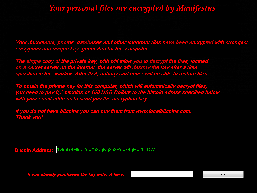 Manifestus RansomwareManifestus Ransomware is a frustrating infection that will encrypt your files and will tell you to restore your data by paying the ransom fee. Supposedly, if you pay the fee, you will be able to get your files back immediately. However, computer security experts say that paying the ransom fee is never the option. There is another way to get your files back, and you should not succumb to this ransomware program’s requirements. Please remove Manifestus Ransomware from your system and then make sure that you do not get infected with similar intruders again. For that, you can use a licensed antispyware tool to protect your PC. The distribution and the infection rate of this program are not too high, so it is not that easy to determine how Manifestus Ransomware spreads around. On the other hand, our security specialists suggest that this program probably comes via spam email attachments. You receive a lot of spam messages every single day, but you probably do not see most of them because they get filtered into the Junk folder. On the other hand, the spam that carries this ransomware infection will land in your main inbox because it will be disguised as legitimate messages from various companies or online stores. If you are used to such notifications, you will soon notice that there is something fishy about it because normally invoices and other necessary information seldom come in email attachments. If you feel that you simply must open a particular attachment, perhaps it would be for the best if you scanned it with a security application first. Then, you would know for sure whether the attached file is safe or not. However, if you have already launched the malicious file, then Manifestus Ransomware has taken over your files and desktop already. It is rather easy to see which files are affected by this program. Every single encrypted file will have a “.fucked” extension added to their original extension. Needless to say, the system will be no longer able to read those files, and the infection will try to convince you that the only way to get your files back is to pay the ransom fee. Check out an extract from the ransom note below: