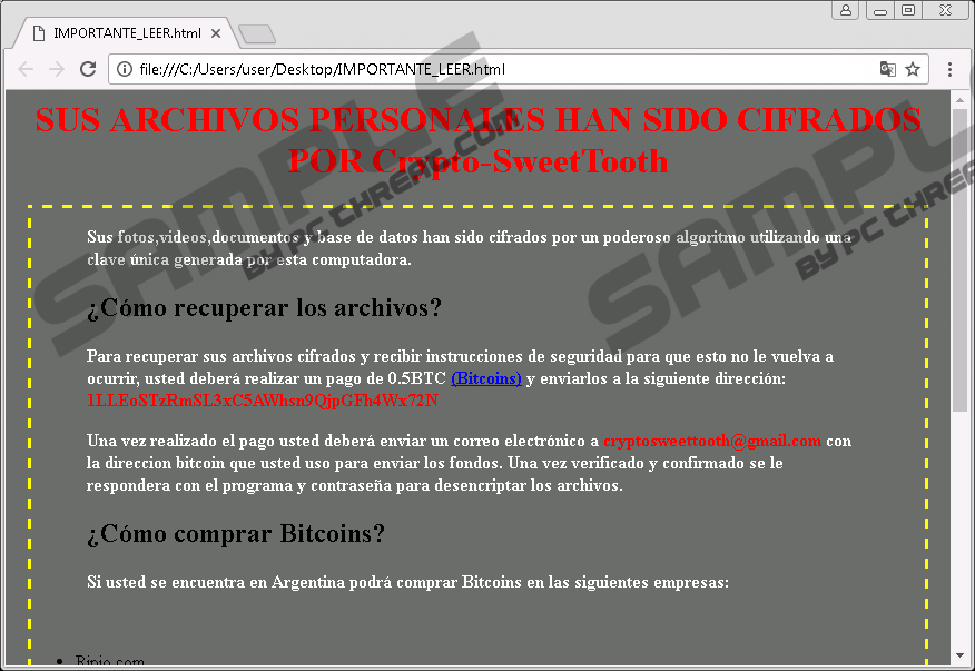 CryptoSweetTooth RansomwareIf you have been attacked by CryptoSweetTooth Ransomware, there is a good chance that you will lose all your pictures, documents, and archives. This new ransomware infection seems to target Spanish speaking countries. Once it manages to slither onto your system, it encrypts your files. The criminals behind this threat offer you the decryption key if you pay the ransom fee within three days. However, you should know that contacting criminals and paying them money is always a risky business, let alone that it is not exactly legal to support cyber crooks either. It seems that your only hope now is to have a recent backup kept on a removable drive. But you should not rush to copy your clean files back onto your hard disk just yet, since first, you need to remove CryptoSweetTooth Ransomware from your system to be secure to do so. Let us tell you in more detail how this dangerous threat can sneak onto your system without your knowledge and how you can avoid similar infections. Our research shows that this ransomware program is mainly distributed as a fake malicious file in spam e-mails. This attached file can be a fake video with alleged pornographic content, such as "videohot_barbie.wmv.exe," which also has a video icon to make sure that you will not have any doubts about it. The sad thing is that unsuspecting users tend to ignore the tiny detail that this supposed video file has an .exe extension in addition to the fake .wmv extension. Such a ransomware program can also be disguised as an image or a document but victims somehow fail to realize the extension and believe that they are actually opening or downloading a "must-see" video, image, or document. Unfortunately, this leads to infecting their system with a very dangerous threat. It is important for you to know that when you open this attachment to view it, you actually initiate CryptoSweetTooth Ransomware. You may consider yourself a cautious computer user but if you have been infected with this ransomware, it means that you did click to open a spam mail and opened its attachment. Criminals can be very deceiving when it comes to spamming. This mail in question may show up as an urgent matter you must check out right away. Since the sender seems all authentic and legitimate, and the subject very convincing, you may really not doubt for a second this is for real. When you open this mail, it may explain in a few sentences that you need to download and view the attached video, image, or document for some made-up reasons. Of course, if it is a porn video, criminals may use trigger words that may make you click to view even if you are not into watching such content normally. Please remember that you should not open questionable e-mails at all, let alone save their attachment. It is always safer to double-check with the sender if the mail and its "package" were really meant for you to receive unless it is obviously a spam. It is vital that you prevent this and any other ransomware programs from entering your computer because you cannot stop them encrypting your files. This is why deleting CryptoSweetTooth Ransomware will not bring your files back although it does make your system secure. In order for you to be able to restore your encrypted files, you either need the unique decryption key stored on a secret server by these crooks or a free tool malware hunters may upload that could crack this infection if it is possible at all. We cannot confirm what type of encryption this dangerous ransomware uses but it is quite likely AES-256 or even a combination with an RSA algorithm, which is a deadly couple responsible for damaging files beyond repair for lots of victims. This infection modifies your encrypted files by adding a ".locked" extension, which has been used by several other ransomware programs, including Guster Ransomware and OzozaLocker Ransomware. Once this malware finishes its encryption spree, it drops two identical .html files named "RECUPERAR_ARCHIVOS.html" and "IMPORTANTE_LEER.html" that contain the ransom note. You learn from this note that your personal files have been encrypted with a serious algorithm and the only way for you to unlock them is to transfer 0.5 BTC (around 440 dollars) to the given Bitcoin wallet. You are also given information about how and where you can by Bitcoins to make it faster and easier for you to act. When you are done with the transfer, you are to send an e-mail to "cryptosweettooth@gmail.com" to prove your payment and to get a reply with the vital decryption key. You have 72 hours to meet the demands or else your key will be destroyed. We do not recommend that you pay these cyber crooks because you may simply lose hundreds of dollars on top of your precious files. If you want to put your system back in order, we advise you to remove CryptoSweetTooth Ransomware from your system immediately. This ransomware seems to belong to the group of similar malware threats that use the same file to operate through without copying itself elsewhere on your hard disk or downloading other components from a remote server in the background. This is why it is really easy to delete CryptoSweetTooth Ransomware from your system because all you need to do is find the file you downloaded from the spam e-mail and bin that file. If you need help with these steps, please follow our guide below. Of course, if you want to clean your system properly and fully, you also need to delete all of your encrypted files unless you hope to find a free file recovery tool in the near future. We believe that such an attack shakes you up and makes you think about the vulnerability of your system security. If you are looking for proper protection, we suggest that you install a reliable anti-malware program, such as SpyHunter. What could be more like peace of mind than automatic malware detection? How to remove CryptoSweetTooth Ransomware from Windows