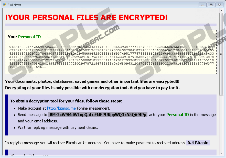 BadNews RansomwareMake no mistake about a program called BadNews Ransomware as it is extremely dangerous. The first major indication that this intrusive program is up and running on your PC is a warning message telling you that you no longer have access to your data. If you unfortunately have already seen this message, make sure not to waste any time and remove it immediately. Initially, ransomware applications are designed so malware developers could profit from Internet users in an illegal manner. This is usually achieved by locking huge amounts of data and asking for a ransom. It is important to note that in some cases your files could be simply corrupted once and for all by this harmful piece of software. To have a better understanding of how BadNews Ransomware works and how you can remove it, make sure to read the rest of our report. It has been found out that BadNews Ransomware is basically a different version of other infamous programs of this classification such as HappyLocker Ransomware, MafiaWare Ransomware, Hollycrypt Ransomware and quite a few others. As it turns out all of the mentioned malicious applications including the one in question are created on an open source project entitled HiddenTear, which at first was used for educational purposes; unfortunately, malware developers found it useful as well. Therefore, nowadays you can encounter a variety of devious programs based of the HiddenTear project. So to no surprise, the malicious program in question functions in an almost identical way to its counterparts. Upon intrusion, it simply identifies files on your hard drive and starts the encryption procedure. Mainly, this malware affects your text and image files; each file locked by it receives a .badnews extension. Right after the encryption process is over the indication of what has happened will be presented to you in the form of a warning message. It hosts a person ID that is required for a decryption procedure. Unfortunately, it can only be useful if you purchase the decryption tool from creators of this malware. It costs 0.4 Bitcoin, which is around $360. Even though it might seem like a way to save your precious data, you must be informed that paying for decryption services does not guarantee that you will actually regain full access to any of your files. It is likely a scam as there is no legal agreement that binds cyber crooks to actually do anything even if they receive your money. It should be more than obvious that a complete removal of BadNews Ransomware is a must if you are a security-conscious user. Our research team highly advises you to take precautionary steps to enhance your overall virtual security if you wish to avoid BadNews Ransomware or any other devious program. Since in quite a few cases this malicious program is spread via spam e-mail campaigns, you should only obtain attachments that come your way from known senders. Also, make sure to avoid all sorts of suspicious third-party download sites as they a notorious for hosting bundled installers. Such dubious setup files are a preferred distribution method by malware developers. Therefore, by avoiding all unauthorized download web pages and obtaining all of your software from their official vendors' websites only, you will significantly reduce the chances of infecting your PC in such a way. While all of this will help you maintain a clean operating system, the most important thing regarding your computer's security is a professional antimalware tool. Such a tool is paramount because it can identify and warn you about any virtual threat beforehand and so it keeps your personal computer safe and secure at all times. The complete removal of BadNews Ransomware should be executed as soon as possible. Even if you are not able to catch this devious application in action, make sure to use the instructions that we present below as soon as you are presented with the warning message. Once you are done with the manual removal, we firmly recommend double-checking your entire operating system for potential leftovers associated with BadNews Ransomware. It is important to perform such analysis since traces of this malware could trigger its silent restoration. If you find all such termination procedure and analysis of your computer a bit too complicated, we advise you to use a professional antimalware tool to delete BadNews Ransomware in an automated manner. How to remove BadNews Ransomware from your PC