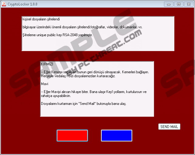 Cryptolocker 1.0.0 RansomwareCryptolocker 1.0.0 Ransomware is a dangerous threat that is most likely to be targeted at Windows users who live in Turkey. Although the name of this infection reminds us of the infamous Cryptolocker Ransomware, our research team has not found any links to this family. It appears that the creator of this threat has chosen the name randomly. The number attached to the name indicates that this is only the first version of this threat, and it is possible that new versions will emerge, considering that this first version is kind of weak. First of all, it is not capable of encrypting files, which, of course, is its main task. Second, it appears that the threat should use SMTP to transmit data, which might include encryption keys, and that has not been set up yet. Regardless, the new and upgraded version of this infection could emerge at any point, and so we have to discuss all of the dangers that the victims might face. In case your files have been encrypted by this malicious threat, do not rush to remove Cryptolocker 1.0.0 Ransomware. Though it is highly important to delete this threat, you do not want to make any wrong moves. According to our research, it is most probable that the malicious Cryptolocker 1.0.0 Ransomware will be distributed via spam emails. Do you know how that works? The distributor of the threat conceals the executable of the threat – for example, it might be represented as the AdobeAcrobatDocument file – and the message representing it pushes you into opening it. One click is all that it might take for the threat to slither into your operating system, and you might not notice it. Once the ransomware slithers in, it should employ the AES (Advanced Encryption Standard) algorithm to encrypt your personal files. It is not yet known if Cryptolocker 1.0.0 Ransomware would attach a unique extension to the files it encrypted, but it is possible that you will find a random extension. Unfortunately, the ransomware can encrypt hundreds of different types of files, which means that personal photos, documents, and other files are likely to be encrypted by this malicious threat. Once that happens, it is unlikely that you will be able to do anything about it. The encryption algorithm is complicated, and so you are unlikely to be able to crack it and decrypt your files yourself. Software that could do that does not exist either. Of course, cyber criminals provide you with one option. As soon as the encryption of your files is complete, Cryptolocker 1.0.0 Ransomware should introduce you to a window with information regarding your files. Also, three buttons should be added as well. The red button, allegedly, removes all encrypted files so that you would not need to worry about the decryption. The blue button should provide you with the decryption option, but only after you communicate with cyber criminals, and you should be able to do by clicking the white button called “SEND EMAIL.”Obviously, if you are able to communicate with the creator of Cryptolocker 1.0.0 Ransomware, you will be asked to pay a ransom in return of a decryption key that you should be able to apply in the “Decrypter” window. At the time of research, it was not possible to communicate with cyber criminals, and we do not know if the threat was even capable of creating the decryption key. Unfortunately, it is possible that you will not get the key even if you the ransom. It is very important that you delete Cryptolocker 1.0.0 Ransomware from your operating system, but you need to take care of the encrypted files first. Will you risk it all and pay the ransom? Will you recover your files from backup? Will you accept the loss? Once you make the final decision, you can take care of the removal of the ransomware as well. The best thing, of course, would be to install an anti-malware tool to have all threats eliminated from your operating system automatically. If that is not what you want, you can try to remove the infection manually. Keep in mind that the name and the location of the main .exe file are unknown, and it is up to you to find and delete it. If you cannot do that, stick with automatic removal. Cryptolocker 1.0.0 Ransomware Removal