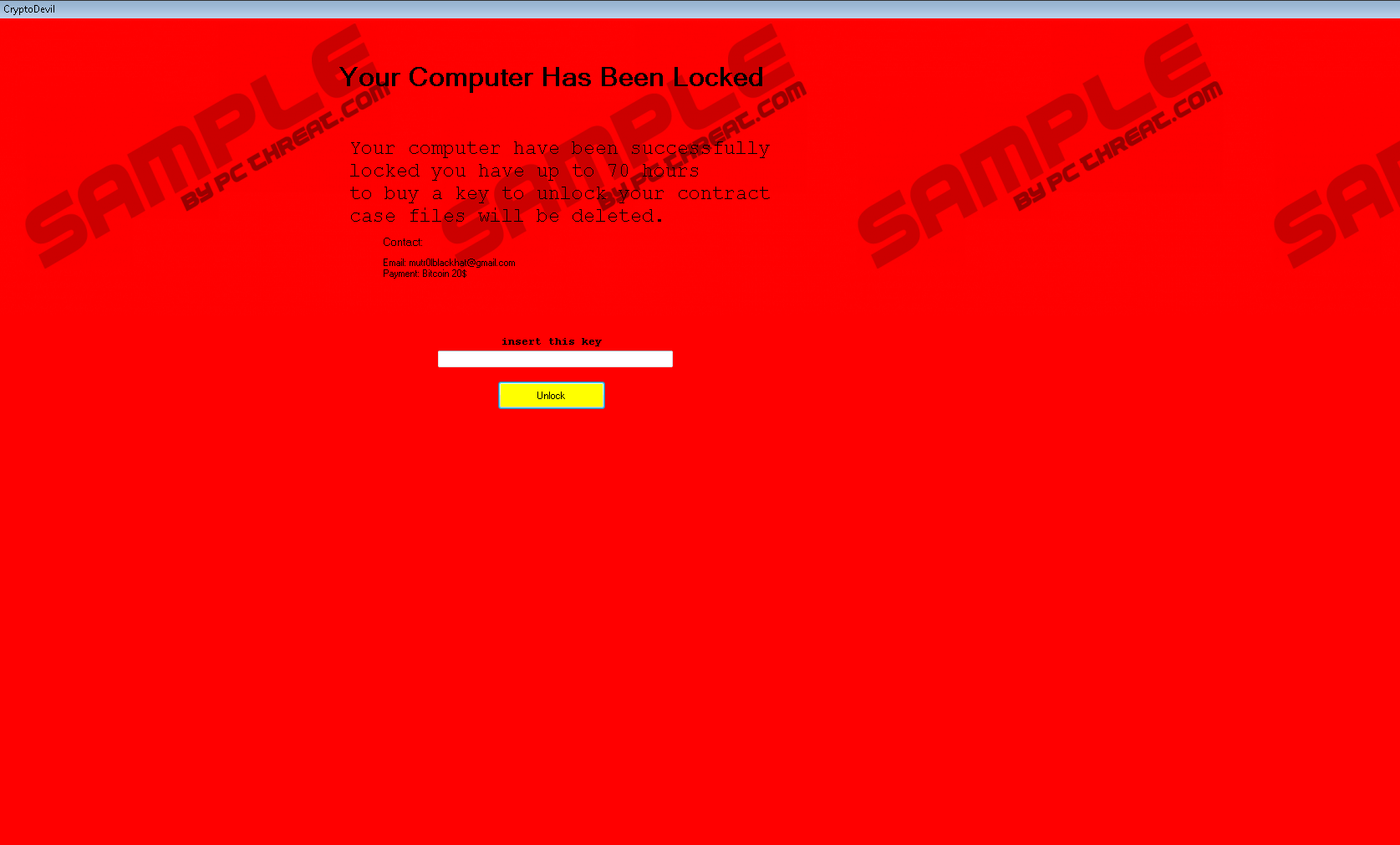 Mutr0lblackhat@gmail.com ScreenlockerMutr0lblackhat@gmail.com Screenlocker (a.k.a. Cryptodevil Screen Locker) is one of these computer infections which cause many problems if they enter computers. The successful infiltration of this malicious application does not mean that your files will be encrypted or you will start seeing tons of commercial ads. Instead, you will find an irritating red window opened in full-screen on your Desktop. It does not, technically, lock the screen because keyboard shortcuts (e.g. Alt+Tab and Win+D) which minimize/close this window still work, but this, without a doubt, does not mean that you can do nothing about its presence. Sooner or later you will find it extremely annoying too because it will not allow you to access programs and files located on Desktop. Luckily, it can be deleted manually without special tools and special keys, so ignore the message located on this screen-locking window claiming that a key for unlocking the computer needs to be purchased. The appearance of a red window “Your Computer Has Been Locked” is directly linked to the entrance of the malicious application called Mutr0lblackhat@gmail.com Screenlocker. As becomes clear after reading the message left for users on this opened window, cyber criminals seek to obtain money from people. It is, of course, not the first malicious application which has been developed to fulfill this objective. In the case of Mutr0lblackhat@gmail.com Screenlocker, it tells users to pay 20 Bitcoin (~$1000) within 70 hours. It is hard to comprehend what the author of Mutr0lblackhat@gmail.com Screenlocker has in mind due to language mistakes, but it seems that it threatens to delete files stored on the computer if users do not contact it by writing an email to Mutr0lblackhat@gmail.com and do not pay money within the given time. To be honest, it is not very likely that this infection can erase files from your PC. On top of that, the annoying window from Desktop can be removed manually too, so there is no point in sending $1000 to cyber criminals too. Better focus on the deletion of malware instead – more information about its removal is provided in the 2nd part of this article. Mutr0lblackhat@gmail.com Screenlocker is that kind of malicious application which makes several modifications once it enters the system successfully. As you already know, first of all, it “locks” the screen by opening a window on it. Second, research carried out by specialists at pcthreat.com has shown that it disables the Task Manager and a keyboard shortcut opening it (Ctrl+Alt+Del). Last but not least, it could have created a Value in HKCU\Software\Microsoft\Windows\CurrentVersion\Run so that it could continue working on the computer after the system restart. This might make it harder to delete this malicious application, but, with our help, you should still manage to take care of it without the help of the automatic malware remover. Before we start talking about the removal of Mutr0lblackhat@gmail.com Screenlocker in detailed manner, let’s analyze how this Trojan infection placing screen-locking windows travels. It should be noted that there might be several different ways it is spread. According to specialists at pcthreat.com, it might travel in spam emails as an attachment, or users could have downloaded it from the web themselves because such threats sometimes pretend to be legitimate software. Last but not least, this infection could have been downloaded on your PC by malware actively working on the system behind your back. It is not as easy to prevent bad programs from sneaking onto the computer as it might seem, so, in the opinion of security specialists, it is necessary to have a security application installed and configured to work 24/7 on the computer. Before you go to delete Mutr0lblackhat@gmail.com Screenlocker, you need to unlock the screen. Type the unlock code kjkszpj in the box on its window. If this does not work, boot into Safe Mode with Networking and go to delete this infection manually or perform a system scan with SpyHunter, a reputable malware remover. If the manual removal method is chosen, you will need to erase a malicious file from your device and also delete the Value created in the system registry, if you find it there. We have decided to help you by providing free step-by-step manual removal instructions. You are welcome to use them to manually erase Mutr0lblackhat@gmail.com Screenlocker. How to get rid of Mutr0lblackhat@gmail.com Screenlocker
