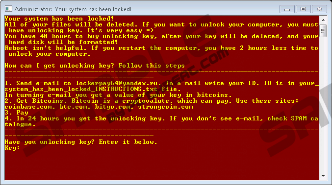 LockerPay RansomwareLockerPay Ransomware, also known as Locker-Pay Ransomware, is an infection that you might let onto your own Windows operating system by opening a corrupted spam email attachment. As you might know – if you keep yourself up-to-date with all virtual security-related news – most ransomware threats are spread via spam emails because their launchers can be concealed as harmless files. Of course, it is not difficult to evade misleading emails and files attached to them if you know about the risk of facing malware, but, unfortunately, many users are usually quite careless. On top of that, once the malicious launcher is executed, there is no indication regarding that. The threat remains silent for as long as the files are being decrypted. Once they are fully encrypted, the infection reveals itself using intimidating messages. After that, you cannot do anything to stop the process. All in all, whether or not you get your personal files decrypted, it is most important that you remove LockerPay Ransomware. Learn how to do that by reading this report. The devious LockerPay Ransomware goes after your personal files because you are most likely to pay a ransom in return of their decryption. While you can reinstall software files and even certain system files, you cannot renew personal files unless they are backed up outside the infected computer. Do you have backups on an external drive? If you do, you can relax because you can recover your files after you remove the malicious threat. If your files are not backed up, you are likely to focus on the intimidating ransom demands. As soon as the encryption process is complete, LockerPay Ransomware displays the “Administrator: Your system has been locked!”window with intimidating demands. The exact same text is also represented via a file called “your_system_has_been_locked_INSTRUCTIONS.txt,” and this file should be placed in every directory containing the encrypted files. The purpose of the message is to inform you that you are expected to email lockerpay64@yandex.ru and then pay a ransom fee to get your files decrypted. If you email the creator of LockerPay Ransomware and reveal your personal ID, you should be introduced to a ransom sum that you are expected to pay to have your personal files unlocked. The question is: Will your files be unlocked if you pay the ransom? Unfortunately, that is impossible to know. While the creator should be capable of providing its victims with a working decryption key, we do not know if they would. On top of that, the ransom fee might be extremely big. Whether or not you have the money to cover the ransom, we suggest looking for a free file decryptor first. At the time of research, a tool that could help did not exist, and we cannot promise that it had been created by the time you are reading this report. In most cases, ransomware infections remain “undecryptable.” Obviously, that is not something you need to worry about if your files are backed up. If they are not, you might be facing permanent loss. In either case, make sure you start backing up ALL of your files after you delete LockerPay Ransomware from your operating system. It is important that you find the launcher of LockerPay Ransomware. This is the main file that you need to delete to get rid of the malicious ransomware. Afterward, you should erase the ransom files scattered across the PC, and you are done. Of course, if other infections are active, you will need to take care of them as well. If you decide to delete LockerPay Ransomware and other infections manually, we advise scanning your PC first. This way, you will know where the malicious .exe file is, as well as all other threats. Needless to say, manual removal is not easy or problem-free. If you are less experienced, it might be best for you to employ anti-malware software right away. Even if you succeed with manual removal, consider using anti-malware software to ensure that your operating system stays malware-free in the future. If you want to ask us questions regarding the threat or its removal, use the comments section. LockerPay Ransomware Removal
