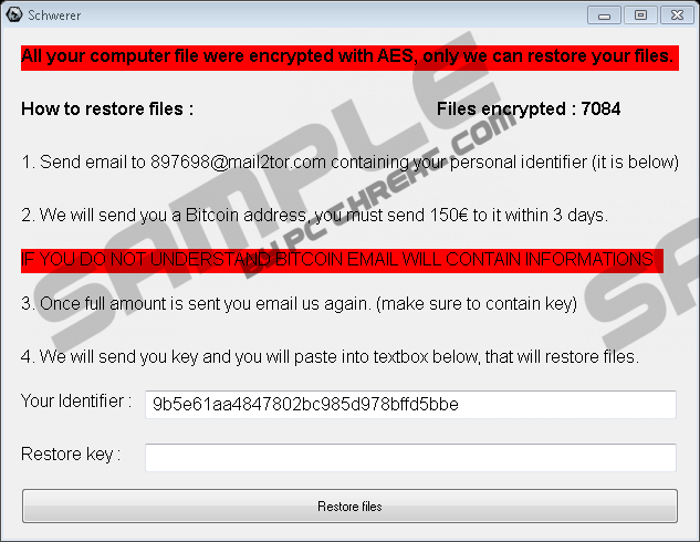 Schwerer RansomwareSchwerer Ransomware is known to be new encryption malware. It has been developed in April, 2017, and it poses a direct threat to users’ personal files. Although it acts just like previously-released ransomware infections, it can be called unique in one sense – it has been developed using a scripting language called Autoit. It, of course, does not mean that it does not perform activities typical for ransomware. Research has revealed that it also enters computers with the intention of encrypting files, so it locks them all right after slithering onto the computer successfully. In addition, it demands money from users too. You will discover a bunch of your files, including pictures, documents, and media files encrypted, but system files will not be touched, meaning that your computer will work normally. We understand that, among these encrypted files, there might be files you need back badly, but we cannot recommend sending money to cyber criminals. Specialists at pcthreat.com are sure that the removal of this ransomware infection is the only thing users should do without consideration. Hundreds of ransomware infections encrypting files are available, but you can be sure that Schwerer Ransomware is the infection you have encountered if you can find an active process pawje.exe in the Task Manager. What also shows that Schwerer Ransomware is on the system is a new extension .schw appended next to original filename extensions of those files that cannot be accessed. Last but not least, a window on Desktop whose first sentence is “All your computer file were encrypted with AES, only we can restore your files” should be opened if you have really encountered this crypto-threat. This window is opened for users to tell them what they can do to unlock their files. Unfortunately, it seems that they do not have many options. This ransom note tells users that they could decrypt their files only if they purchase the special key. It costs 150 euro, and money has to be paid within 3 days. Before making a payment, users are asked to send an email to 897698@mail2tor.com with a personal identifier (it is placed at the bottom of the opened window) to get the Bitcoin address and payment instructions. The chances are 50-50 that the decryption key will be sent to you after you transfer your money. Our researchers say that there are many cases when users get nothing after sending the required money to creators of ransomware, so they do not recommend doing that. They say that you should delete Schwerer Ransomware as soon as possible and then recover files from a backup. If a backup of files does not exist because you have never backed up your files, do not hurry to delete those locked files from your computer. It is very likely that specialists will release a free decryption tool sooner or later. We are sure you did not downloaded Schwerer Ransomware willingly on your computer, but it is very likely that you helped this computer infection to sneak onto your PC. Of course, you were not aware of that. Users usually allow ransomware-type infections to enter their systems by opening malicious attachments from spam emails. These spam emails are not always placed in the Spam folder, which suggests that users must be careful with emails sent from unknown senders too. What is more, it is highly recommended not to download software from dubious pages because the malicious file of ransomware might be masqueraded as, for example, an installer of a reputable application. Our security specialists also recommend acquiring security software. If you keep it enabled, malicious software could not enter your computer. No matter how Schwerer Ransomware has entered your PC, it is a must to erase it as soon as possible because it will keep working actively on your computer and might encrypt new files again. We are sure you will not find its removal easy because you will need to delete its files, registry keys, and kill its process in the Task Manager. If you have never deleted serious malware from your PC before, you should let our manual removal guide help you to take care of this crypto-ransomware. Alternatively, an automatic malware remover, such as SpyHunter, can be used to delete it automatically. Keep in mind that it cannot decrypt those files locked by Schwerer Ransomware, but it will surely fully remove this ransomware-type infection for you. Delete Schwerer Ransomware manually