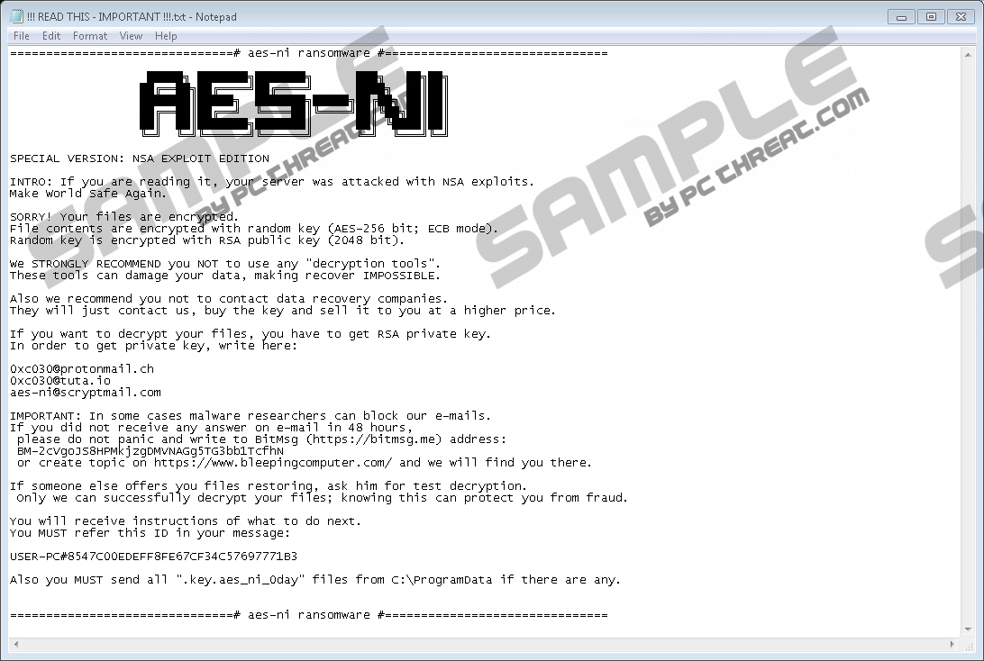 AES-NI RansomwareThe emergence of AES-NI Ransomware on your computer could be an awful indication of losing all your important files. This ransomware infection can infiltrate your system without your knowledge and encrypt your personal files with virtually impossible-to-hack algorithms and extort money from you in exchange for the private key needed for decryption. Unfortunately, there is no guarantee whatsoever when it comes to paying ransom fee to cyber criminals. How could you trust someone to keep their promise when they attack you with such a vicious program? What if you transfer the money and get nothing in return? How would you feel when you realize that you supported cyber crime and you lost your files as well? These questions you need to consider before making up your mind. As a matter of fact, the only possible way for you to save your files is to have a recent backup copy you made onto a removable drive. But even if you have such a copy, your first move should be to remove AES-NI Ransomware from your system. In fact, it is possible that you will not even find the malicious executable file anymore as it can delete itself automatically after this attack. Nevertheless, it leaves a few leftovers behind that have to be removed to restore your system. Our research and tests show that this particular ransomware mainly targets servers. Although we do not have concrete information about how this infection is spread on the web, we believe that it could be manually installed after a brute force Remote Desktop Protocol attack. This means that cyber criminals may try to gain access to your server by attacking it and thus figure out your password. Unfortunately, a lot of servers are out there on the web that are not properly protected or the passwords given by lazy system administrators might be easily hacked. In any case, once these criminals have access to your server, they can easily install and activate this dangerous ransomware and infect all computers available from the server. This is the type of attack that you will never see coming until it is already too late to delete AES-NI Ransomware as your files will all be encrypted. It is also possible that a hacking tool used by the NSA called DoublePulsar is also used to spread it, which has been leaked recently and so far tens of thousands of computers have been reported infected with it. It is also important for us to mention that most ransomware programs are spread via spam e-mails and Exploit Kits. Therefore, you need to be more cautious when you open your mails either in the spam folder or in your inbox. Such a spam may appear to be quite convincing that there is an urgent issue that requires your immediate attention. This is how many unsuspecting users download the attached file that is indeed a malicious executable that will initiate the attack. It is vital that you keep your browsers and drivers updated too because malicious websites can use Exploit Kits to drop such ransomware infections onto your system behind your back. It is enough for you to land on such a page and a malicious script can be triggered right away. Once again, by the time you are ready to remove AES-NI Ransomware, it will be too late for you to save your files. Keep in mind that removing this ransomware program is not equal to recovering your encrypted files. Once this ransomware infection is activated on your system, it injects itself into svchost.exe to encrypt your most important files with AES-256 algorithm. The generated decryption key is then further encrypted using RSA-2048 algorithm, which makes is practically impossible to crack this threat. All the encrypted files get a new ".aes_ni_0day" extension, so you will know exactly what has just hit you. It seems that this infection also drops a .txt file in all affected folders called "!!! READ THIS - IMPORTANT !!!.txt", which contains the ransom note text. It seems that this vicious program deletes itself after the attack; therefore, you do not need to care about the executable itself, but it does not mean that you do not need to eliminate all other leftovers. This ransomware does not lock your screen and does not replace your desktop background either. Instead, it creates a registry entry to make sure that upon every reboot you will be presented with a Windows screen that displays the ransom note right before you could actually log in. This note claims that your "server has been attacked with NSA exploits" and that the only way for you to get your precious files back is to contact these crooks via e-mail. You are provided with three e-mail addresses, including "0xc030@protonmail.ch" that you can use to send your unique ID disclosed in this note. In a reply message, you are supposed to get further instructions as to how much money you have to transfer and where exactly. Cyber criminals usually ask for Bitcoins and the fee could range from 0.1 up to 1 or 2 BTC, which is $150 up to $1,500 or $3,000. Obviously, this amount depends on who attacks you and who they target. Nobody can believe that a private citizen would have thousands of dollars to pay for some old documents and photos. However, corporations have usually more to lose in such an attack. In any case, we do not recommend that you contact these criminals or send money to them; although, it is all your own business. We advise you to remove AES-NI Ransomware and all related files from your computer immediately. As we have already mentioned, one part of the elimination process has already been done automatically as this ransomware can delete itself after it finishes encryption. But it is just as important that you remove the registry entry it created and all the .txt files it littered your system with. If you need help with this, please use our instructions below. It is possible that after this attack you may consider protecting your system more effectively. We recommend that you employ a trustworthy anti-malware program, such as SpyHunter because an up-