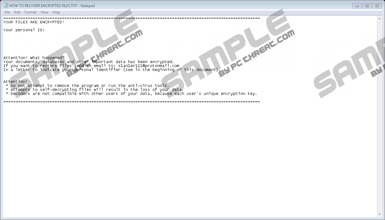 Amnesia RansomwareWhen Amnesia Ransomware slithers into your operating system, it adds the “.amnesia” extension to many of your personal files. The unique extension is added only to help you see which files were corrupted, and so there is no point in deleting it. Needless to say, by eliminating this extension, you will not unlock your files. Unfortunately, the ransomware uses a highly complex algorithm to encrypt your files, and only a special decryption key/private key can crack the code. So, where is this key? Well, it is kept by the cyber criminal who has created the ransomware. This infection was designed in a way so that you would follow all of the demands to get the decryption key, and, unfortunately, they include paying a ransom. Even if money is not an issue for you – and the creator of the threat is likely to request a huge sum – paying the ransom is not a good idea because it is unlikely that a decryption key would be sent to you anyway. Unfortunately, you will not get your files decrypted even if you remove Amnesia Ransomware. According to the research team working in our internal lab, Amnesia Ransomware was built using the Delphi programming language. Delphi has been used by the developers of RSUTILS Ransomware, Extractor Ransomware, and other similar infections. Just like most other ransomware threats, these ones have been found spreading via misleading spam emails with the installer concealed as a harmless attachment. However, Amnesia Ransomware could also be spread using RDP exploits. Once the installer is executed, a new file is created in the %APPDATA% directory. This file automatically deletes itself once the encryption is completed. This file could be named “guide.exe”. Another file that the ransomware creates is called “HOW TO RECOVER ENCRYPTED FILES.TXT”, and this one is not removed because it represents the ransom demands. According to our analysis, this file should be copied to every folder where encrypted files are found. Because the threat does not lock the screen or change the background, it is most likely that you will recognize its existence only after you find the ransom note or realize that you cannot open your files. The ransom message represented by Amnesia Ransomware was created only to make you communicate with cyber criminals. The message includes an email address (s1an1er111@protonmail.com) that you allegedly need to write to if you want to have your personal files decrypted. The ransom message also includes a few warnings. The first one warns against deleting Amnesia Ransomware. The second one discourages you from decrypting the files yourself. If you decide that you want to contact cyber criminals – note that you will not be able to have a decent conversation with them – you should create a new email address. That is because you do not want cyber criminals knowing your real email, which they could later flood with all kinds of spam emails. All in all, if you contact the creator of the ransomware, you are most likely to be introduced to a ransom fee demand. Should you pay the ransom? As mentioned previously, that might be a bad idea, and so we do not recommend that. If your files were really important, you probably have them backed up anyway, and you can retrieve them after you remove the ransomware. Deleting Amnesia Ransomware is very important, but the chances are that this threat has already deleted itself. If you realize that you have downloaded a malicious file right away – and you might realize that if, for example, it did not open when you downloaded it from a spam email – you might be able to remove it before anything bad happens. If your files were already encrypted, we suggest scanning your operating system using a legitimate malware scanner to see if your PC is clear. If any threats are found – no matter how minuscule they might appear to be – you have to remove them immediately. Needless to say, erasing unwanted files and keeping your operating system malware-free are not easy tasks. Due to this, we encourage you to install anti-malware software that is created to keep your operating system clean at all times. If you have questions for our research team, add them to the comments section. Removal instructions