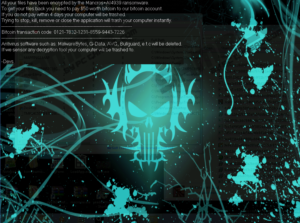 Mancros RansomwareMancros Ransomware is a screen-locking infection that tries to convince its victims that the files on the infected operating systems are encrypted. Because the infection paralyzes the Desktop using a full-screen window that you cannot close in a normal manner, you might be tricked into thinking that your files have been corrupted. With so many dangerous ransomware infections (e.g., Wana Decrypt0r Ransomware or Decryption Assistant Ransomware) on the loose, it is easy to fall for this scam. If a real ransomware slithers in, it usually allows you to check the encrypted files, and ransomware threats that are capable of locking screens are very rare. In conclusion, if you receive a message/notification suggesting that your files are encrypted, the first thing you want to do is assess the situation. Unfortunately, the creator of this ransomware has thought about that, and you might be deterred from checking things out. Please continue reading, and you will learn more about this, as well as the removal of Mancros Ransomware. Note that is sometimes recognized by names Mancrosai4939 Ransomware and Mancros+AI4939 Ransomware. Mancros Ransomware Ransomware slithers in – and it is not yet clear how it does that – it immediately locks the screen using a scary full-screen window. An image of a skull is represented along with a message suggesting that your personal files were encrypted. You are requested to make a payment of $50 in Bitcoins within 4 days. The message also informs that if you try to “stop, kill, remove or close the application,” your computer will be “trashed;” whatever that means. That is exactly what might deter you from closing the window and realizing that your files are not encrypted. Fortunately, there are a few things in this message that might help you realize that it is misleading. First of all, it does not provide you with any details on the “bitcoin account” to which you supposedly need to transfer the money. Also, there is no information explaining what will happen when you pay the ransom. Though it is implied that you would get your “files back” by paying it, there is no explanation as to how that would happen. If you hold down the Alt key and then click the Tab key once, you will be introduced to a list of open windows. If you were not using your computer before the malicious Mancros Ransomware slithered in, you will only see the minimized version of the screen-locking window, as well as the Desktop window. Using the tab key – or the mouse – select Desktop and tap Enter on the keyboard. This will help you unlock your screen. Right after that, you need to launch the Task Manager and terminate the malicious process linked to the screen-locker. If you do that successfully, you can then delete Mancros Ransomware, and we recommend doing that as soon as possible. Although this infection is not incredibly malicious, it is controlled by cyber criminals who are unpredictable. Do you want them to have access to your operating system? If you do not, you need to delete the ransomware as soon as possible. The good news is that you do not even need to be experienced to get rid of this devious infection yourself. Can you identify the launcher of the malicious Mancros Ransomware? If you can, go ahead and remove it as soon as you disable the screen-locker and kill the malicious process. If you can perform these tasks, the elimination of this threat should not scare you. However, if you are having difficulties with the detection of the malicious .exe file, manual removal might seem intimidating and complicated. If that is the case, you want to look into anti-malware software. In fact, we recommend using this software even if you are experienced and can delete Mancros Ransomware manually. This software can fully clean your operating system from all existing infections (others could be present as well), and it can guarantee full-time protection in the future. Remember that there are far worse ransomware threats out there, ones that could encrypt your files permanently, and if you do not protect your operating system, the chances of you attracting this kind of malware are much greater. Mancros Ransomware Removal