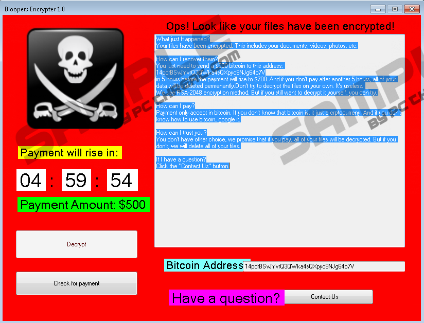 Blooper RansomwareWhen there is one big bad guy on the block, you can be sure that you will find a lot of copycats, trying to bask in their supposed glory. Blooper Ransomware happens to be one of such copycats that appears to be mimicking the notorious WannaCry Ransomware. Fortunately, this program seems to be more about scaring users than actually doing any harm. So it should not be a problem to remove Blooper Ransomware from your computer. On the other hand, if this copycat managed to enter your system, it means that the real deal could access your computer too, so you need to be careful. To avoid such infections you need to know how they spread around. Our research suggests that Blooper Ransomware spreads via spam email messages. The same could be said about WannaCry Ransomware, although so far security researchers have not figured out the exact distribution method. They only know that WannaCry Ransomware employs a worm infection, allowing it to infect all the system on the network the moment it gets into one target computer. Of course, Blooper Ransomware is nothing of the kind, but it still does not deny the fact it can trick users into installing it on their systems. Normally, spam email messages get filtered into junk folders these days, but sometimes they could be really sophisticated and land in your main inbox. Since the spam messages that distribute Blooper Ransomware and other malware may look like invoices from online shops or other important messages from financial institutions, you should take note whether the message seem to be random or not. Have you bought anything lately? Are you really a member on the site that claims to have sent you the message? Is the email in your language in the first place? Consider a number of signal questions before opening the message. If it has an attachment and you feel that you must open it, take your time and scan it with a security tool of your choice. It is always better to be safe than sorry. Now, if you get infected with Blooper Ransomware, there is no need to panic because this program DOES NOT encrypt your files. It only says it does so you would think this is the end and you must pay the ransom fee. The program, on the other hand, does collect the ransom fee, and if users are too shocked to check whether their files are okay, they might transfer the payment without any second thought. After all, this is the notification that appears on your screen: