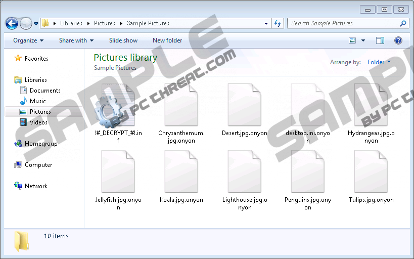 OnyonLock RansomwareOnyonLock is one of the ransomware infections that encrypt file but do not lock the computer screen. The OnyonLock ransomware encrypts a huge range of files, except for .exe Internet browsers. Upon encrypting .jpg, .doc, .ppt, and tens and hundreds of other files, the OnyonLock ransomware adds its extension .onyon to the existing one. Photos and other valuable information becomes inaccessible, unless you have a copy of your files backed up in a storage device or a cloud. In any case, it is important to remove the infection from the computer to prevent new malicious downloads and data losses. Typically, a ransomware infection locks the screen and displays a full-screen ransom warning in which the victim is informed about changes made on the computer. The latest ransomware threats lack the feature locking the screen. Instead, the infections creates a file with a ransom warning on the desktop or in some other location. The OnyonLock malware creates several ransom files in different directories, which is probably done to boost the chances for the victim to open one of the files featuring the ransom warning. The file is named "!#_DECRYPT_#!.inf" and is open in the notebook. The attackers' message gives detailed information about the encryption made on the computer. Victims are informed that all their files are encrypted and that the encrypted files can been restored after paying a certain amount of money. The release fee depends on how quickly victims react and contact the attackers at decrypter@onyon.su. According to the ransom message, after receiving the money, they will send the user a decryption program. To guarantee that they are serious about the deal, they offer the victim to decrypt up to 3 files for free if the total size of the files has is smaller than 10 MB. Another important condition is that those files should not contain valuable information, which probably means that the victim should not provide files containing usernames, passwords, or some other identifiable information. Our advice is to ignore such attackers' claims as there are little chance that some crooks would bother to decrypt your files. Their major goal is to swindle you out of your money without mercy. As to paying the ransom, the hackers use a electronic currency called bitcoins, which can be bought online on different websites at similar exchange rates. We advise you against spending money on this hoax as your investment in some decryption software is likely to be useless. Not all ransomware developers are capable of providing decryption keys or utilities, but their ability to create a destructive product has already brought huge profits. Instead of risking losing a possibly high sum of money, back up your data and take action to prevent similar issues in the future. Those computer users who are not familiar with this type of malware may think that such cases should be treated seriously. The attackers threaten that by using third-party decryption software the user may permanently lose valuable data, which openly implies that the user is supposed to trust the ransom message blindly and follow the instructions given. Our expert advice is to remove the infection and shield the system from other ransomware infections so that you do not have to deal with online privacy-related issues in the future. An unprotected operating system can get infected any time, and this is usually done without the user's knowledge and consent. Such infections as the OnyonLock ransomware are installed silently alongside freeware or retrieved by malware downloaders. The longer you keep the computer unprotected, the bigger the risk. Fortunately, the removal of the OnyonLock ransomware does not require professional knowledge about malware. An inexperienced user can remove the OnyonLock malware manually as it is enough to delete several malicious files. However, the infection can be disguised as a regular file, which makes identification slightly complicated. The downside to removing the infection manually is that we cannot specify the exact name of the malicious files, so you delete files at your own risk. In case you do not want to try removing OnyonLock manually, use our recommended security program. How to remove OnyonLock ransomware