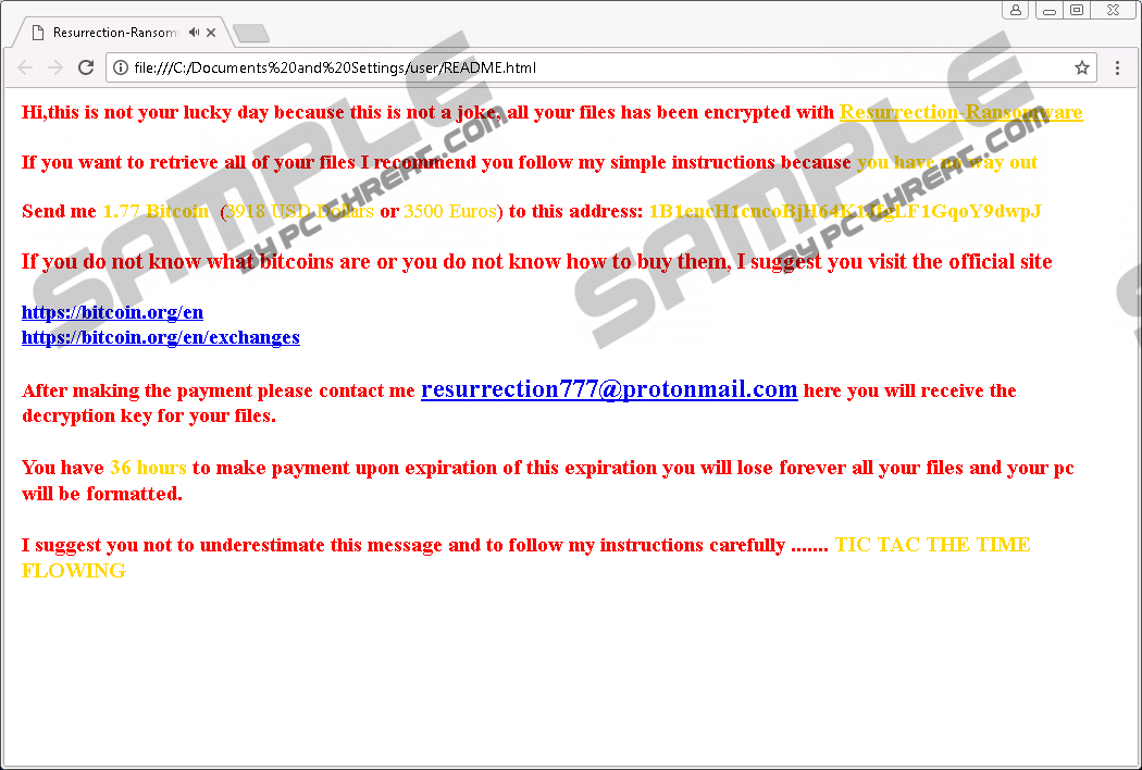 Resurrection RansomwareA new HiddenTear-based ransomware infection Resurrection Ransomware has been recently detected by specialists working at pcthreat.com. It does not differ from older ransomware infections much because it has also been developed to encrypt users’ files and extract money from them. Of course, if you encounter the version of Resurrection Ransomware that does not work properly, you will, most probably, find your all files intact. In any event, you cannot keep Resurrection Ransomware inside your system because it might help other malicious applications to enter your PC easier and, on top of that, it might encrypt your new files with a strong encryption algorithm AES (Advanced Encryption Standard) again. Unfortunately, it is extremely difficult to unlock files encrypted by ransomware infections, so we cannot promise that you could get them back if you have already encountered Resurrection Ransomware. Fortunately, it will not be that hard to remove this infection from your computer. It is not one of those computer infections which create new registry keys in the system registry, drop a bunch of files in different directories, or block system utilities. Therefore, we are sure you will manage to remove it after reading this article till the end. Once Resurrection Ransomware is launched on users’ computers, it tries to contact its C&C (Command & Control) server. If it establishes communication with it successfully and gets the key from it, the encryption of users’ personal files starts. Of course, before locking them, this infection finds where they are located. Resurrection Ransomware locks all kinds of files it finds on users’ computers, including pictures, videos, music, etc. They all get a new extension .resurrection – it is appended next to the file name. After the encryption of files, this infection drops a ransom note in an .html format (README.html). It can be found on Desktop and in two directories: %HOMEDRIVE% and %USERPROFILE%. It has an audio source (http://topalbums.biz/file/8999896.mp3), so do not be surprised if you hear a sound when you open the ransom note. It is not the only new file you will find on your computer after the entrance of the ransomware infection. You could also locate a Recovery.key file on Desktop. While Recovery.key contains a “key:” line and a unique victim’s ID, README.html tells users what has happened to their files (“Hi, this is not your lucky day because this is not a joke, all your files has been encrypted with Resurrection Ransomware”) and tells users that they can only get their files back by sending 1.77 Bitcoin (~4650 USD at today’s price) to cyber criminals. After making a payment, victims have to send an email to resurrection777@protonmail.com and wait for the decryption key to reach them. Frankly speaking, specialists at pcthreat.com do not think that you will get this key. Cyber criminals only seek to extract money from you, so they might send you nothing after getting what they want, i.e. money. Therefore, we do not recommend sending money to cyber criminals. You should go to remove Resurrection Ransomware instead and then try to get your files back in a different way, e.g. recover the encrypted data from a backup. Since Resurrection Ransomware is not one of these ransomware infections spread actively, we do not have much to say about its distribution either. Although it is not the easiest thing to talk about its dissemination, specialists at pcthreat.com suspect that it is also mainly spread via spam emails. It is a common way to distribute ransomware infections – they travel in these emails as attachments. To be frank, it is not the only way crypto-threats are promoted. Cyber criminals might put them on file-sharing websites as well. Therefore, you must be careful at all times. It is recommended to install a reputable security application too. Perform two removal steps to erase Resurrection Ransomware fully from your computer. You first need to kill its process and then delete all files it has created on your PC, including its launcher. If you have never done that before, let our instructions (find them below this article) to help you. In case you find the manual method too complicated, delete Resurrection Ransomware automatically instead. You will only need to have an automatic malware remover. Unfortunately, even an automated scanner will not be able to unlock your files if they have all been already encrypted due to the entrance of Resurrection Ransomware. How to remove Resurrection Ransomware