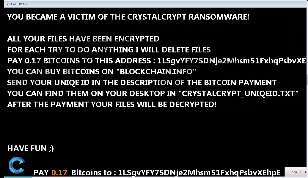 Crystalcrypt RansomwareCrystalcrypt Ransomware is a newly released computer infection that can cause you major problems if your computer is unprotected from malware. This particular program was designed to encrypt your personal files and then offer you to buy a decryption program from its creators to recover your files. In short, the developers engage in the extortion of money and, thus, they are nothing short of cyber criminals. However, you should not comply with their demands as they can trick you and not send you the decryptor once you have paid the ransom. In this short description, we will talk about how this particular ransomware is disseminated, how it works, and how you can remove it. Crystalcrypt Ransomware is similar to LightningCrypt Ransomware, and we are more than positive that they both come from the same developers. It is also reasonable to think that the same developers will probably release more clone ransomware-type programs to generate as much money as they can before the gig is up. We believe that the developers use email spam to infect the computer’s of unwary, curious users. The emails are sent to random email addresses and they are probably tailored to impersonate legitimate companies. They may use their logos to give people a false sense of legitimacy. The emails can be disguised as tax return forms, invoices, receipts and so on. The emails contain the ransomware in an attached file that will infect your PC with Crystalcrypt Ransomware once you open it. Apparently, Crystalcrypt Ransomware uses the RSA 2048 and AES 256 algorithms to encrypt your files. We believe that this ransomware creates a public encryption and private decryption keys and sends the decryption key to a remote server to be stored until the ransom is paid. Since this program is relatively new, a free decryption key has not been developed but it might be if malware researchers are successful. In any case, Crystalcrypt Ransomware is a major problem as was configured to encrypt pictures, documents, executables, and other files. Nevertheless, it leaves vital executables alone as not to disrupt the functionality of the operating system. While encrypting your files, this ransomware will append them with a “.BLOCKED” file extension, but will not change the original names of the files. Once this program completes the encryption, it drops a text file in each folder where files have been encrypted. The name of this text file is CrystalCrypt_Recover_Instructions.txt. The information inside the text file says that you need to pay 0.17 Bitcoins which is an approximate 475 USD. Evidently, your files may not be worth that kind of money, so the obvious solution would be to simply delete this ransomware as well as the encrypted files and try to restore as many encrypted filed from remote storage drives. The ransom note also features links where you can buy Bitcoins and also where to send them. In closing, Crystalcrypt Ransomware is one of many ransomware- type programs that you can get via email spam, so you should take caution when opening unknown emails from shady addresses as well as emails that the email provider redirected to the Junk Box. If your PC becomes infected with this ransomware, then you will be unable to get your files for free as there is no free decryptor yet. However, paying the ransom might not be an option for you and we discourage you from doing so as complying with cyber criminals will only serve to embolden and encourage to produce more malware. We suggest that you use SpyHunter’s free scanner to locate the malicious files and then go to their respective locations and remove them. Removal Instructions