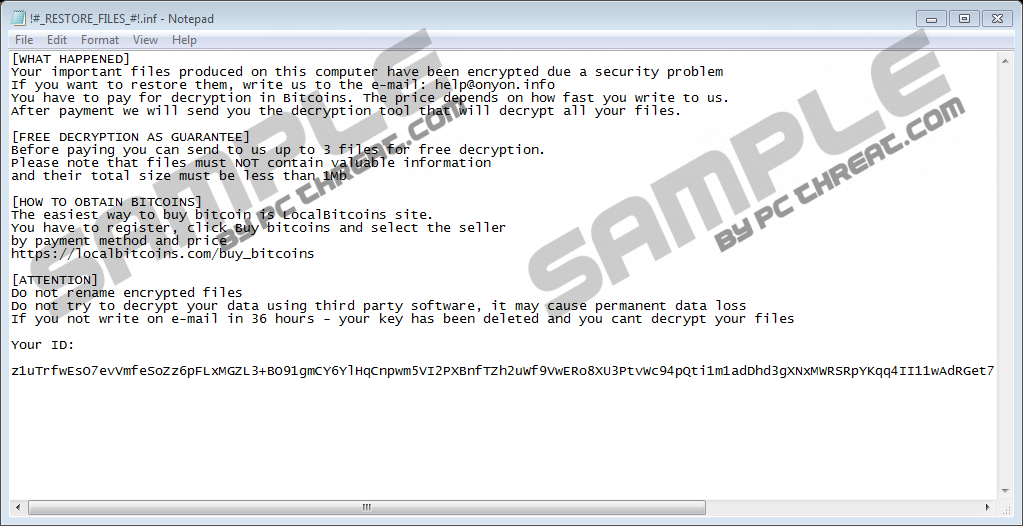 Helponyon.info RansomwareHelponyon.info Ransomware is a malicious application which illegally slithers onto computers and then encrypts files by adding a new filename extension .[help@onyon.info].master to all encrypted files. It is a version of Master Ransomware, and it does not differ much from the previous version of this ransomware infection – it only appends a new extension to those files it encrypts. Since this infection changes an email address daily, we are sure we will write about versions using other emails in the future. No matter which version of this nasty infection you encounter, you must remove it from your computer as soon as possible and, of course, do not send the money required. Helponyon.info Ransomware is one of those computer infections which enter systems so that it could extract money from users, so this infection will surely not miss an opportunity to ask for a ransom after locking your personal files successfully. Do not give cyber criminals your money because they will not stop developing new versions of this infection. Additionally, you cannot be so sure that you will get your files decrypted after making a payment to cyber crooks. Helponyon.info Ransomware is a part of the Btcware Ransomware family, so it acts just like its predecessors and, consequently, it does not have any unique features. After the successful infiltration, it finds users’ pictures, documents, and media files. Then, it locks all those files by appending a new extension. When all files are locked and can no longer be opened by users, it creates a ransom note !#_RESTORE_FILES_#!.inf on Desktop. This file tries to convince users that they have found their files locked due to a security problem. Also, they find out that they can restore them only by writing an email to help@onyon.info and paying for the decryption of files in Bitcoin. It seems that users will find out the price of the decryption of files only when they write an email to cyber criminals: “The price depends on how fast you write to us.” If you are not going to pay a ransom, do not even bother writing an email. Instead, focus on the deletion of this infection from your computer. Although developers of this infection promise to unlock 3 files for free to show that they are capable of unlocking the encrypted data, it does not mean that they will unlock your files after receiving your money. Also, we are sure that they will not remove Helponyon.info Ransomware from your computer. It does not mean that you cannot get your files back if you decide not to pay cyber criminals money. You can easily recover those files for free from a backup. Research carried out by specialists at pcthreat.com has managed to reveal that Helponyon.info Ransomware not only encrypts files, but also executes two commands after the successful entrance. First, it deletes shadow copies using this command: cmd.exe /c vssadmin.exe Delete Shadows /All /Quiet. Then, it disables the startup repair by issuing the following two commands: cmd.exe /c bcdedit.exe /set {default} recoveryenabled No and cmd.exe /c bcdedit.exe /set {default} bootstatuspolicy ignoreallfailures. As can be seen, it is quite a sophisticated malicious application. It is not very easy to talk about the distribution of Helponyon.info Ransomware because it is a newly-developed ransomware infection and, consequently, its infection rate is still small. Of course, it does not mean that our researchers have not even tried to find more about it. After carrying out research, our specialists are 99% sure that this infection is mainly spread through unsecured RDP connections. This is the major distribution strategy; however, this threat might be spread differently too. For instance, it might be disseminated via spam emails. Cyber criminals are developing ransomware infections every day, so you should go to install a security application on your computer today. It will not allow any new threat to slither onto your system ever again. You can delete Helponyon.info Ransomware either manually or automatically from your computer. If you adopt the first removal method, you will need to kill processes linked to the ransomware infection, delete suspicious files, and undo changes made in the system registry manually yourself, so follow our step-by-step guide in order not to miss a single component of the ransomware infection. In case you choose the automatic method over the manual one, you will only need to scan your computer with a trustworthy malware remover once. Delete Helponyon.info Ransomware