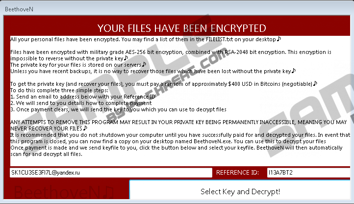 BeethoveN RansomwareNo matter how much you love classical music, BeethoveN Ransomware will hit you hard as this malicious program can encrypt all your personal files so you will not be able to use, open, and view them anymore. The attackers want to extort hundreds of dollars from you in exchange for the private key that can automatically decrypt your files. But how could you trust the ones that attacked you with this vicious program in the first place? Why would you believe that they will send you anything after you transfer the ransom fee? Well, unless you have a backup on a removable drive or in a cloud storage place, there is no chance as of yet to decrypt this ransomware with any free tools. We cannot claim that no such program will emerge on the web in the near future but so far malware hunters have not come with a solution at the time of our research. In any case, we recommend that you act now and remove BeethoveN Ransomware from your system. But before you rush to do so, let us explain more about this dangerous program. It is possible that you infected your computer with this threat by opening a spam e-mail. In fact, it is not the opening that triggered this malicious attack; although, there are indeed ransomware threats that can automatically drop and activate by your opening the mail itself. This ransomware has been reported spreading as a malicious attachment. This means that you may find this spam mail very important even if it shows up in your spam folder. Crooks use either existent or made-up sender names and e-mail addresses that may strike you as completely legitimate. The subject field is another important part of the deception and it usually regards an issue that would seem urgent to you. Such matters include overdue invoices, unpaid fines, credit card issues, and so on. Most people could not possibly refrain from opening such a spam and download its attachment to view it as soon as possible. However, once you run this file, you can say goodbye to your personal files. Keep in mind that if you delete BeethoveN Ransomware, you will not recover your encrypted files automatically. You also need to be careful when you are downloading free programs and updates from suspicious file-sharing websites or when these are offered by third-party pop-up ads. One wrong click and you can drop this infection onto your system. The web is swarming with unreliable ads that you should never engage with; even more so when these are displayed on shady websites. However, when your computer is infected with adware, you should be even more careful whenever you go online because such an infection can also show you unsafe ads that could drop this infection. We also need to mention the possibility that you land on a malicious page created with Exploit Kits that can trigger the drop of this ransomware. This method only works if your browsers or drivers are out of date. Therefore, you can easily avert this by always keeping these updated. When you launch the malicious executable of this malicious infection, it targets your most important personal files right away, including your photos, documents, videos, archives, and databases, and encrypts them using the AES-256 algorithm combined with RSA-2048. These tow algorithms applied together result in a virtually impossible-to-crack decryption key. This does not mean, of course, that malware hunters do not try to find a way around it, but it might take some time till they can come up with a free file recovery tool. You can easily recognize the encrypted files as they get a “.BeethoveN” extension. Anyway, you can also find out about the encrypted files by opening the “FILELIST.txt” text file on your desktop. As a matter of fact, there are already two versions of this threat even though it is merely one month old. There are some minor differences between the two, for example the encrypted file list is called “FILEUST.txt” in the original version and there is some difference in the ransom note as well. When the attack is over, the ransom note program window comes up on your screen. In the updated version an e-mail is mentioned, “SK1CU3SE3FI7L@yandex.ru,” where you need to send an email with your Reference ID that you can also find in this window. Then, you are supposed to get further instructions about the money transfer. If you do not send $400 worth of Bitcoins, which is supposed to be “negotiable,” within 168 hours, your private key will be deleted. We do not recommend that you send this amount to these criminals because this could be just money down the drain, not to mention the fact that you would support cybercrime, too. Even if you do not have a backup, it is important that you remove BeethoveN Ransomware from your system. Fortunately, this ransomware does not lock your screen so you can easily close the ransom note window by pressing the Alt+F4 combination. Once done, you need remove a Windows registry entry and the related files from your system, and that is all. If you need help, please use our guide below. Hopefully, you see now why it is so important to think about prevention and protection. If you do not feel to have the required skills and web surfing savvy, we suggest that you install a reliable malware removal application like SpyHunter that can take care of all your system security problems automatically. Your peace of mind could really be a few click away. How to remove BeethoveN Ransomware from Windows