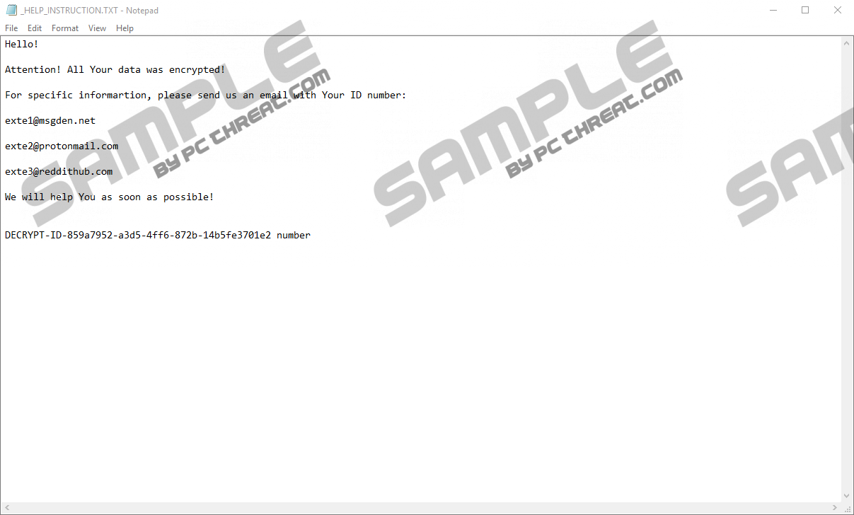 Exte RansomwareLetting Exte Ransomware onto the Windows operating system is a huge mistake because this infection can lead to the permanent corruption of your personal files. Although it is believed that the encryption algorithm used by this threat will become decipherable in the near future, we cannot guarantee this. Of course, if this ransomware has attacked your PC and encrypted your files, you should not rush to do what the creator of this infection wants you to do. Instead of initiating communication with them and then, potentially, paying a ransom, you should look for a free decryptor that, hopefully, would free your personal files. We are hopeful about this because other infections that derive from the same family, including Mole Ransomware, CryptoShield Ransomware, and Revenge Ransomware, are all “decryptable.” Our research team has thoroughly inspected this malicious infection, and if you want to learn more about it, the information you can find in this report will be very useful. We also discuss the removal of Exte Ransomware because this task is extremely important, and you should take care of it as soon as possible. Do you have any idea as to how Exte Ransomware got into your operating system? Was it executed as you opened a corrupted spam email attachment? Or did you let it in when executing a malicious software bundle? You might not figure out how exactly this threat got in, but if you do, make sure you do not make the same mistake again. For example, if you have opened the launcher of the threat via a spam email, you should become more cautious about that. In fact, our research team strongly recommends deleting spam emails as soon as you find them. Do not interact with the attachments or the links represented via them. Once the infection is executed, it starts the encryption process right away. Exte Ransomware adds itself to the startup to ensure that the infection is active even if the victim restarts the computer. During the encryption, the infection attaches the “.EXTE” extension to the names of all encrypted files, but the worst part is that it also changes the names of these files, which can cause problems identifying them. Hopefully, you are sure that most important files are backed up, and you do not need to worry about the rest. To introduce the victim to the ransom demands, Exte Ransomware creates the “_HELP_INSTRUCTION.TXT” file. This file displays a message that urges you to contact exte1@msgden.net, exte2@protonmail.com, or exte3@reddithub.com. You are instructed to send your ID – which is also displayed within the message – to one of these email addresses to get more “specific” information. What does that mean? If you email the creator of Exte Ransomware, you will get instructions showing how to pay a ransom. Because of this, we are not sure how big the ransom that the infection demands is. Overall, whether it is 1 USD or 1000 USD, you should refrain from paying it because that would not lead you anywhere. Do you think that cyber crooks would provide you with a legitimate decryption key if you paid the ransom? Well, that is unlikely to happen, and so we do not recommend getting involved. The removal of the ransomware, on the other hands, is unquestionable, and you should take care of the threat as soon as possible. More importantly, you should take care of your system’s protection to ensure that you do not face other threats in the future. The manual removal guide below is not too hard to follow if you have at least a little bit of experience with the elimination of unwanted software. Of course, you do not have to go through with manual removal. Instead, you can install an anti-malware program, and we think that that it is the better option. Why? Because reliable anti-malware software can simultaneously delete Exte Ransomware and reinforce the overall system’s protection you need. When it comes to the decryption of your files, we have already discussed that paying the ransom is a bad idea. We have also discussed that a legitimate file decryptor is likely to emerge, so keep an eye out for it. After you get your operating system cleaned and, hopefully, files restored, you need to ensure that your PC stays malware-free in the future. Also, you should back up your files – if you have not done this already – because that can save you from permanent loss in the future. Exte Ransomware Removal