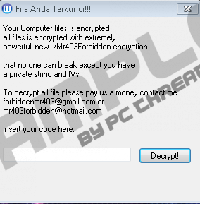 Mr403Forbidden RansomwareIt is unknown yet if Mr403Forbidden Ransomware will spread in the future, but, at this point in time, it does not appear to slither into unguarded operating systems and encrypt the files found on them. This is not surprising, considering that Ransed Ransomware, BrainLag Ransomware, and many other infections have been found to be just as helpless. The volume of ransomware infections nowadays is mind-blowing, and so it is natural that many of them are created by people who do not know the first thing about malware. After researching this ransomware, our malware experts have concluded that there is a possibility for this infection to become a real threat, which is why we have decided to analyze it and share our findings with you. In case this malicious threat has invaded your operating system, please comment below immediately. Also, if new developments occur, we will continue analyzing this threat further. Right now, we have to look at all problems that regular users might face in case this ransomware became a serious threat. Needless to say, we also discuss the removal of Mr403Forbidden Ransomware. It is most likely that the C&C server that Mr403Forbidden Ransomware communicates with is down, and that is why this threat is not fully active. Of course, that can change at any moment. There are plenty of things that are very unpredictable when it comes to this infection, and the distribution is one of them. Since the threat is not actively spreading, it is hard to say how Windows users would attract it. Of course, the operating system has to be unguarded; otherwise, the infection’s launcher would be removed before anything malicious was initiated. If the operating system is not guarded, various security backdoors can be used to infiltrate this threat. According to our research, spam emails are utilized by most threats of this kind, and malicious installers are attached to them to trick users into executing them without realizing the danger. Once the ransomware is executed, the encryption should start not long after that. According to our analysis, the files encrypted by the threat should get the “.alosia” extension appended to their names. Unfortunately, we could not figure out if the infection was also capable of renaming files, which some ransomware threats can do. Upon execution, Mr403Forbidden Ransomware should open a window entitled “File Anda Terkunci!!!,” which translates to “your file is locked” from Indonesian. The message within the window, however, is presented in English, and it informs that there is only one way to decrypt the files, and that is by paying a ransom. There is no information regarding the payment, which is why the two email addresses (forbiddenmr403@gmail.com and mr403forbidden@hotmail.com) are added. Allegedly, if you email the creator of Mr403Forbidden Ransomware, you will get a code that will initiate the decryption of your files. First, of course, you would have to pay money to get this code. Is the decryption code real? Will it be provided to you after the payment of the ransom? Taking into account that the victims of ransomware infections are usually left empty-handed, it is safe to say, that the code will not be given to you, and that is why we do not recommend paying the ransom. Although the information about Mr403Forbidden Ransomware is limited at the time of our research, the removal of this malicious infection is unlikely to be extremely complicated. In fact, the chances are that you can remove this threat by eliminating its main launcher. Once you erase this threat, you definitely should perform a full system scan to check if the operating system is clean. If you need to delete Mr403Forbidden Ransomware leftovers or any other infections, you will be informed about it, provided that the malware scanner you are using is legitimate and up-to-date. Of course, the safest bet would be to install legitimate and reputable anti-malware software. First of all, it will automatically erase any malicious threats. Second, it will provide you with a reliable defense system against malware in the future. One more thing to think about is the protection of your files, which you can take care of by setting up a trustworthy file backup system. Mr403Forbidden Ransomware Removal