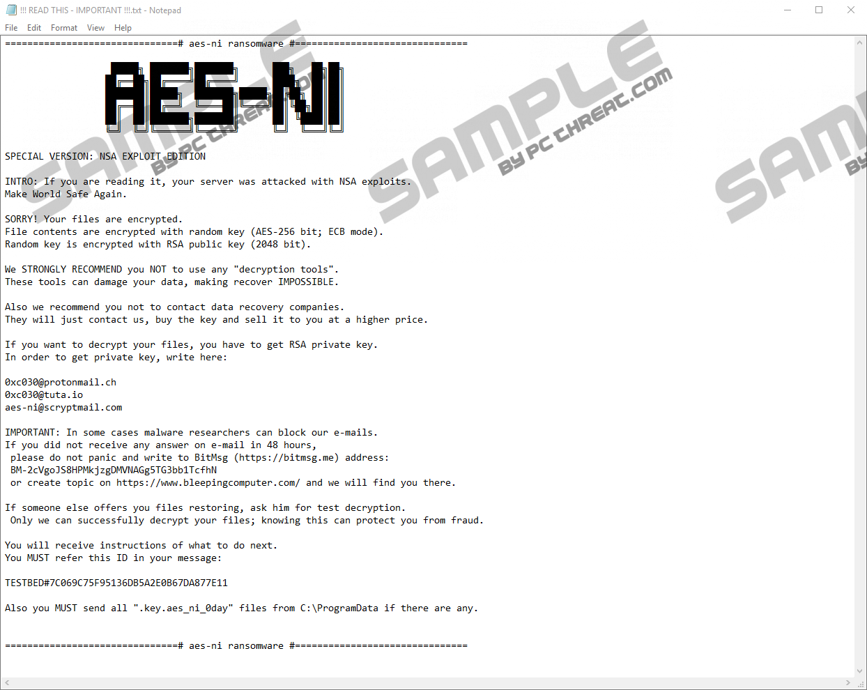 SOREBRECT RansomwareSOREBRECT Ransomware is a tremendously malicious infection that is often recognized by a different name, “AKA AES-NI Ransomware.” This infection is known as a file-less threat, which means that it employs a regular system component (in this case, it is the svchost.exe process) and that it can delete itself. The only comforting thing about this threat is that you do not need to worry about its elimination. On the other hand, this threat leaves a mess behind, and that is extremely worrying. If this infection attacks successfully, it encrypts all personal files that are located on your operating system. Although it avoids encrypting .exe, .dll, .lnk, and .sys files, your personal photos and documents are likely to be corrupted. The threat employs the AES (Advanced Encryption Standard) algorithm to corrupt your files, and, unfortunately, there is no way of deciphering it manually. All in all, even if you end up losing your files, you must not forget to remove SOREBRECT Ransomware. Continue reading to learn how to do that. While most ransomware infections use spam emails to spread, SOREBRECT Ransomware exploits RDP and PsExec vulnerabilities. When the infection slithers in, it should add the “LegalNoticeText” key to HKEY_LOCAL_MACHINE\SOFTWARE\Microsoft\Windows NT\CurrentVersion\Winlogon\. The value of this key should include a message regarding the hacking of your server. Here is the full message: “Dear Owner. Bad news: your server was hacked. For more information and recommendations, write to our experts by e-mail. When you start Windows, Windows Defender works to help protect your PC by scanning for malicious or unwanted software.” After encrypting the files on the computer (the corrupted files should get the “.aes_ni_0day” extension), the malicious SOREBRECT Ransomware should create a file called “!!! READ THIS - IMPORTANT !!!.txt”. Copies of this file are likely to be placed in every folder that contains encrypted files. Besides all that, the ransomware has also been found to stop over 200 different services on the computer. Some of these services are related to security systems, and the ransomware stops them to prevent removal. Others are linked to data backups, and these are stopped to prevent users from recovering their files. The creator of SOREBRECT Ransomware is not shy about telling you what they want, and they do that using the “!!! READ THIS - IMPORTANT !!!.txt” file. This text file carries a message informing that you need an RSA key to get your files decrypted, and to obtain it, you need to email one of the three emails (0xc030@tuta.io, 0xc030@protonmail.ch, or aes-ni@scryptmail.com) first. The BitMsg program is introduced as an alternative means of communication. According to the ransom note, if you send cyber criminals your ID (it can be found in the ransom note) and the “.key.aes_ni_0day” files located in %PROGRAMDATA%, a decryption key will be provided to you. Unfortunately, that is not how things work. At first, you will be asked to pay a ransom, and it could be quite big. If you choose to pay it in the hopes of retrieving the decryption key, remember that that is unlikely to happen. Unfortunately, the creators of ransomware infections rarely worry themselves with the presentation of decryptors, and, instead, they usually disappear as soon as the ransom payment is complete. Although SOREBRECT Ransomware deletes itself, there are components that still require removal. First of all, you should look for a file called “$RECYCLE.BIN” in the %HOMEDRIVE% directory. If this file is present, delete it without further hesitation. Also, we recommend deleting all copies of the ransom note file because you do not need this junk on your PC. When it comes to your files, you might have to remove the corrupted copies as well. If your personal files are backed up – for example, on an external drive – you need to make room for them. Needless to say, you should connect to backups and transfer files only after you remove SOREBRECT Ransomware. Unfortunately, decrypting your files without the special private key is currently impossible. To prevent malware from infecting your operating system and encrypting your files in the future, we strongly advise employing trusted anti-malware software. SOREBRECT Ransomware Removal