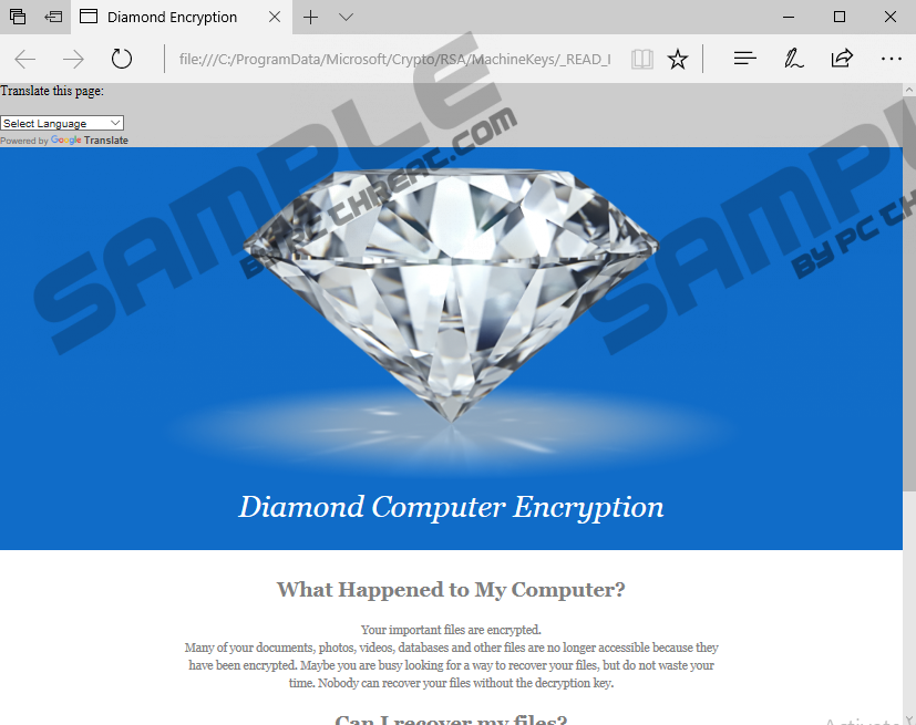 Diamond Computer Encryption RansomwareCyber criminals nowadays thrive of illegal profits that they make from unsuspecting Internet users by using ransomware applications. One program of this category is known as Diamond Computer Encryption Ransomware. The scheme works in a relatively simple manner. Once such malicious program enters the computer, it encrypts a massive chunk of data sorted on it and then demands a ransom in return for decryption services. It is unfortunate that users without advanced computer knowledge easily fall prey to all of this. Our researchers have thoroughly analyzed the malware in question and in this report we provide comprehensive information regarding its devious inner workings. In addition to all of that, we also present virtual security advice that will help any user keep their operating system clean and secure at all times. Furthermore, our malware experts have crafted an easy-to-follow removal guide that you must use to delete Diamond Computer Encryption Ransomware once and for all if it is ever found active on your personal computer. Diamond Computer Encryption Ransomware works quickly and aggressively. As soon as it gains full access to your operating system, it immediately starts the encryption procedure. This process is completely silent. Such functionality means that there is virtually no way of stopping this ransomware from locking your data. During the analysis, our researchers have discovered that it mainly targets picture, video, and document files. Just like many of its contemporary counterparts, this malware uses a robust algorithm to encrypt your data. Due to the strength of the cipher manual decryption is out of the equation. As soon as all the dirty work is done, you will notice a file on your Desktop entitled _READ_IT_FOR_RECOVER_FILES.html. That is a ransom note, which provides information about the fact that a lot of your files are no longer accessible. It also informs that you can decrypt your data only with a unique key, which, of course, is held by the cyber crooks. Not surprisingly, cyber criminals demand a payment of 0.1 Bitcoin, which is about $300, in return for your files. Under no circumstances abide by these requests as you could lose not only your data but a significant amount of money as well. That is so because malware developers are not bound legally to decrypt your files even if you make the Bitcoin transaction to the provided address. As you can see, having this malicious piece of software active on your PC can have disastrous outcomes. Be sure to execute a thorough removal of Diamond Computer Encryption Ransomware at the very same moment that it is found active on your PC. Taking action against programs such as Diamond Computer Encryption Ransomware is crucial especially nowadays as they are extremely prevalent. To sustain a clean and secure operating system at all times, you first need to start practicing safe browsing habits. We highly recommend avoiding all suspicious websites as they might present you with devious content such as ads, pop-ups, and coupons, which could host redirect links. Unfortunately clicking on such content might lead you to malicious sites designed by cyber crooks in such a way that just entering them could be enough to infect your personal computer. Likewise, we advise you to bypass all unauthorized third-party download web pages because they are notorious for being the primary source of bundled installers, which often suspicious and potentially dangerous programs. Another prevalent method of distribution used by cyber crooks nowadays is spam email campaigns; therefore, it is imperative to stay away from any attachment that comes your way from am an unknown source. Lastly, but most importantly, be sure to obtain and install a licensed antimalware tool if you do not have one already. Such a tool is critical to your overall virtual security since it can detect and delete any harmful application automatically. It should be more than obvious why the removal of Diamond Computer Encryption Ransomware must be executed without any delay. Be sure to pay your utmost attention to every single step of the removal guide that we present below. Keep in mind that a single mistake could lead to an incomplete removal, meaning that leftovers linked to Diamond Computer Encryption Ransomware might remain active on your PC. This is a situation that you do not want to find yourself in since traces of this malware could be capable of restoring it without your knowledge. To be sure that the termination procedure has been successful we encourage you to double-check your operating system for anything associated with Diamond Computer Encryption Ransomware as soon as you are done with the manual removal instructions. Another way to be sure that no devious traces are active on your PC is scanning your computer with a professional antimalware tool because it can identify and remove any suspicious or malicious content from your PC automatically. How to remove Diamond Computer Encryption Ransomware from your PC